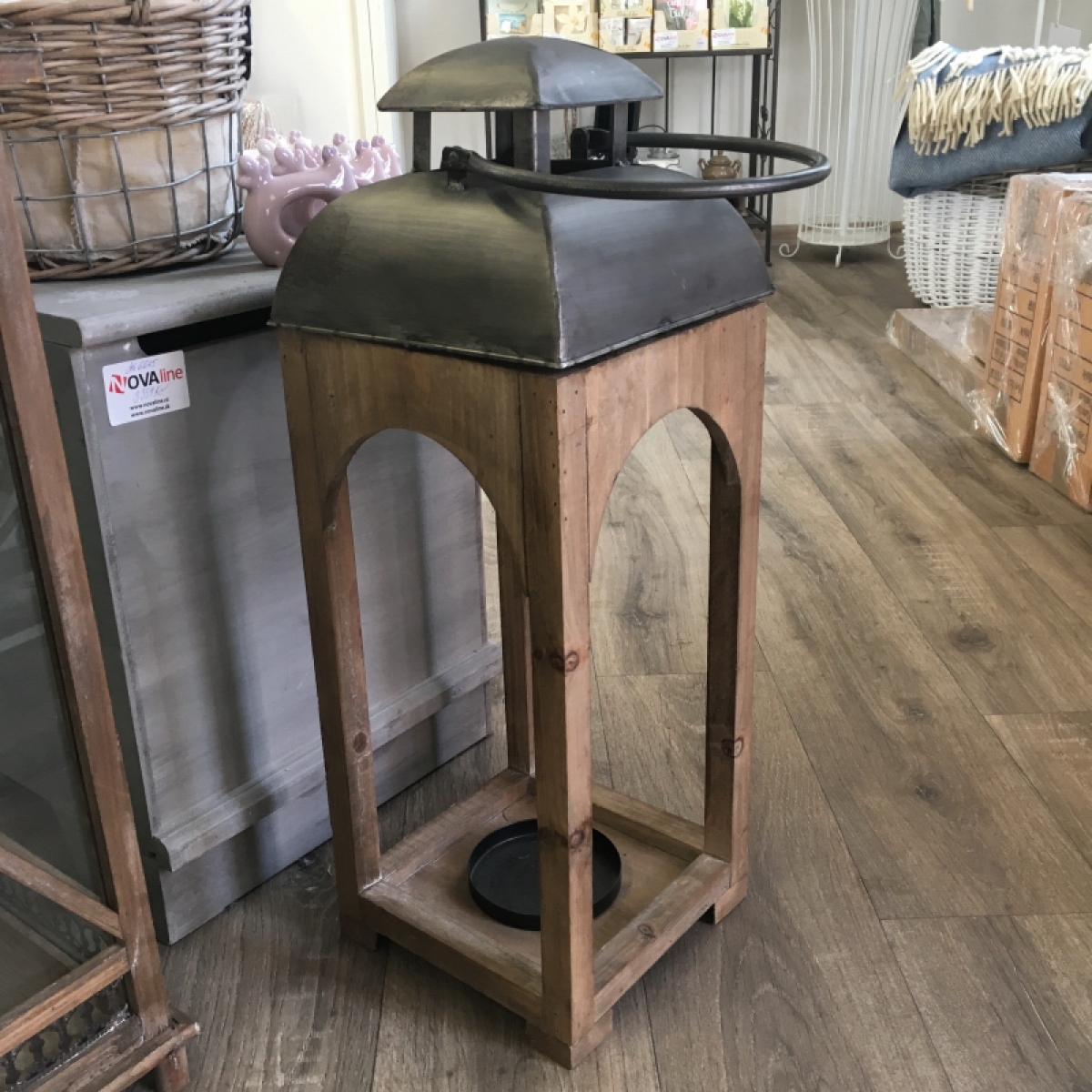 Drevená lucerna má kovovú striešku a ucho. Táto lucerna o veľkosti 65cm je tou väčšou z dvoch vyobrazených lampášov na poslednú fotografiu.