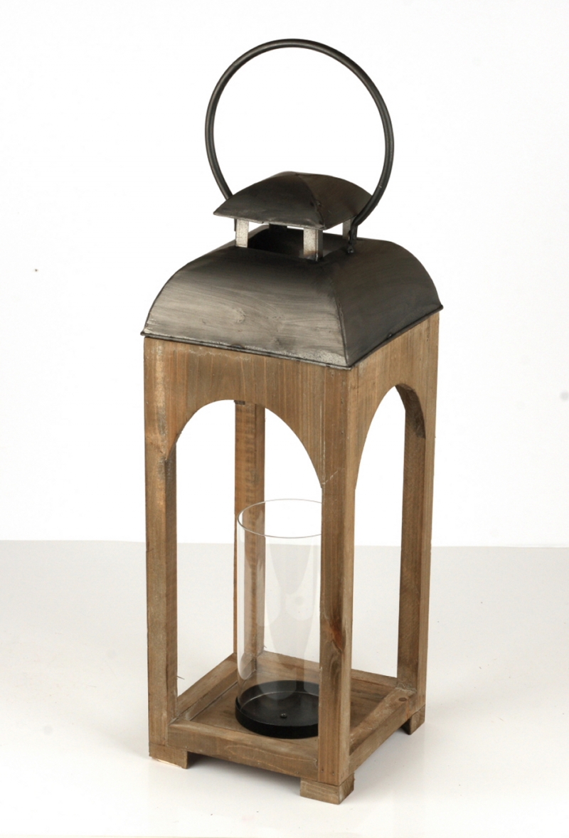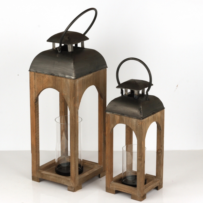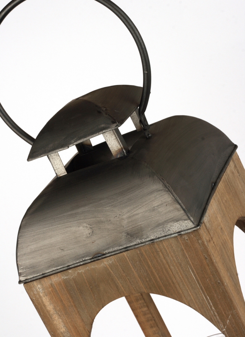 Drevená lucerna má kovovú striešku a ucho. Táto lucerna o veľkosti 65cm je tou väčšou z dvoch vyobrazených lampášov na poslednú fotografiu.