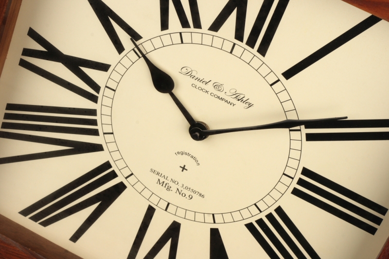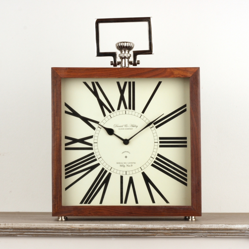 Stolové hodiny so štvorcovým ciferníkom zdobia veľké rímske číslice, ktoré sú neprehliadnuteľné aj z veľkej vzdialenosti. Rám hodín je drevený a má kovový úchyt.