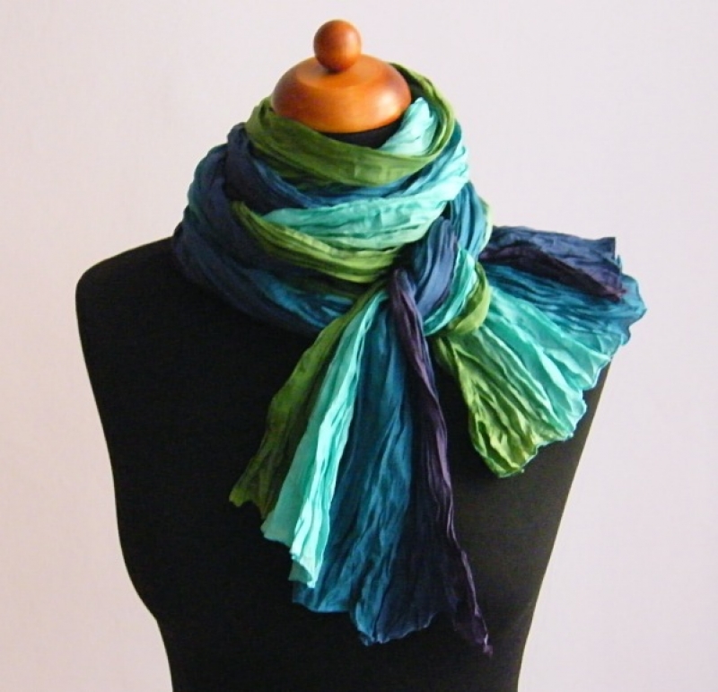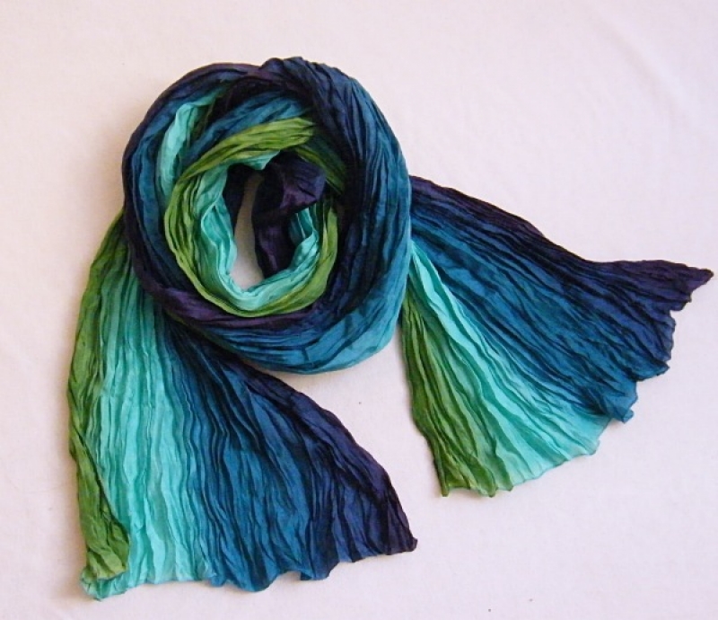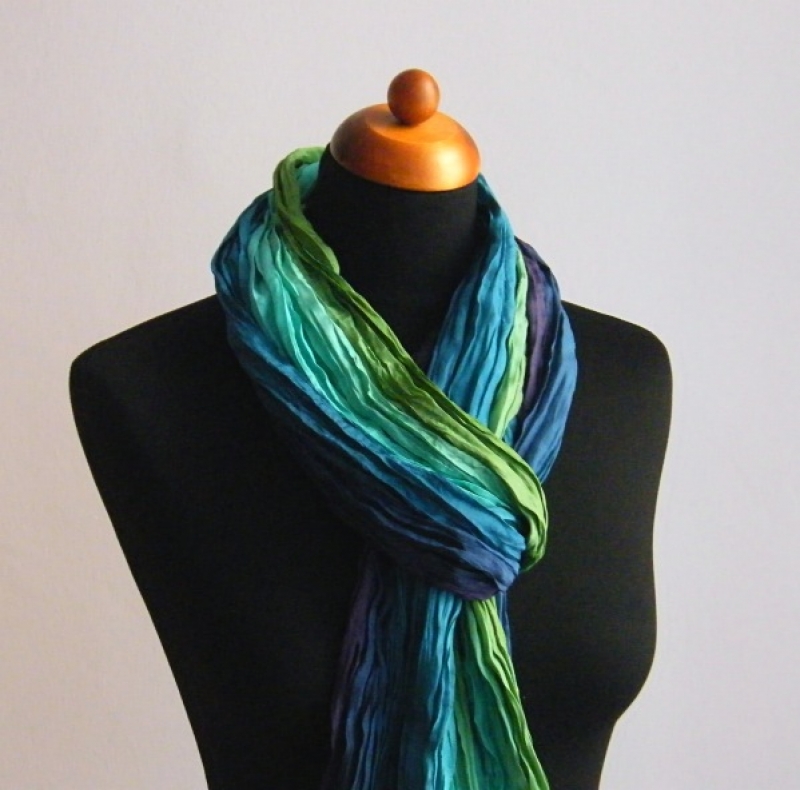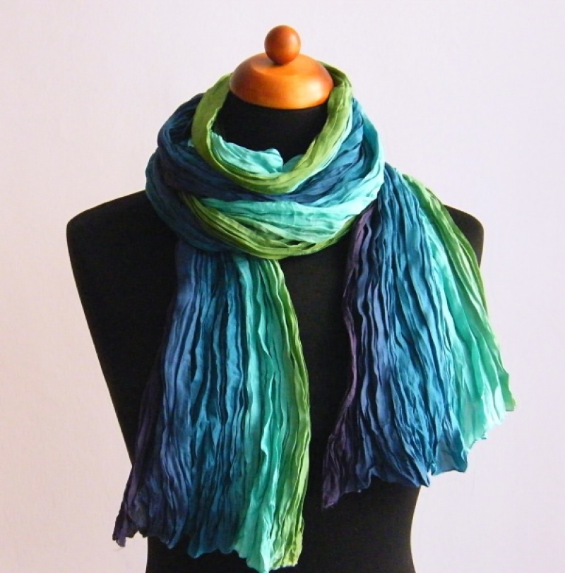 Hedvábná šála příjemné velikosti 55x200 cm. Šálu lze vyžehlit do hladka, dle chuti a vkusu následně znovu navrapovat.