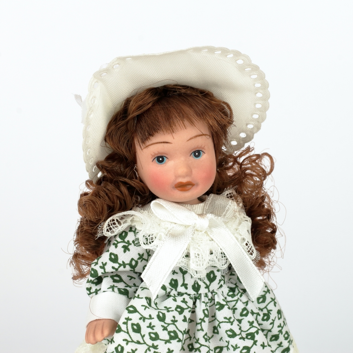 Mini bábika je vyrobená z porcelánu s látkovými šatami a klobúkom.