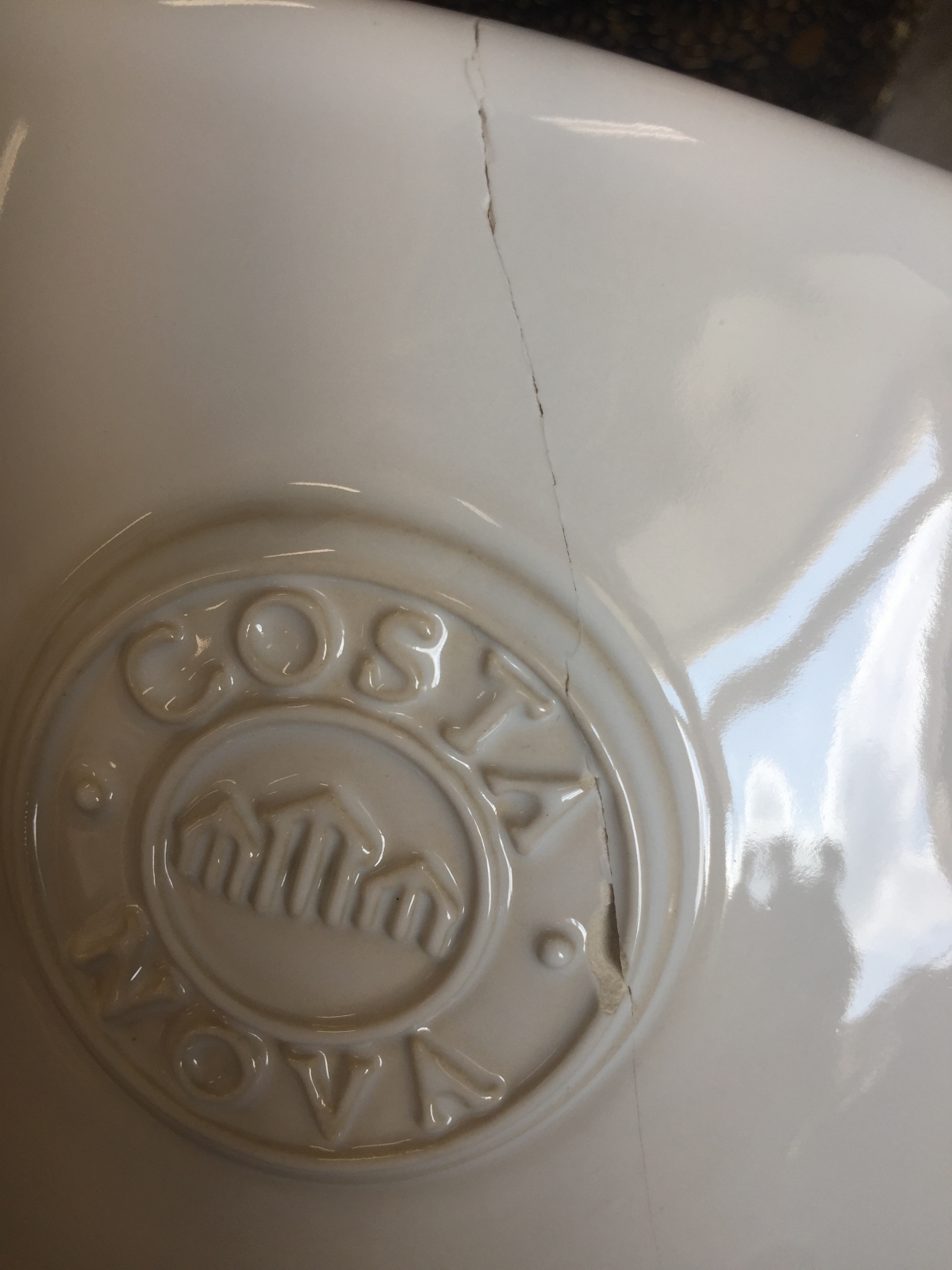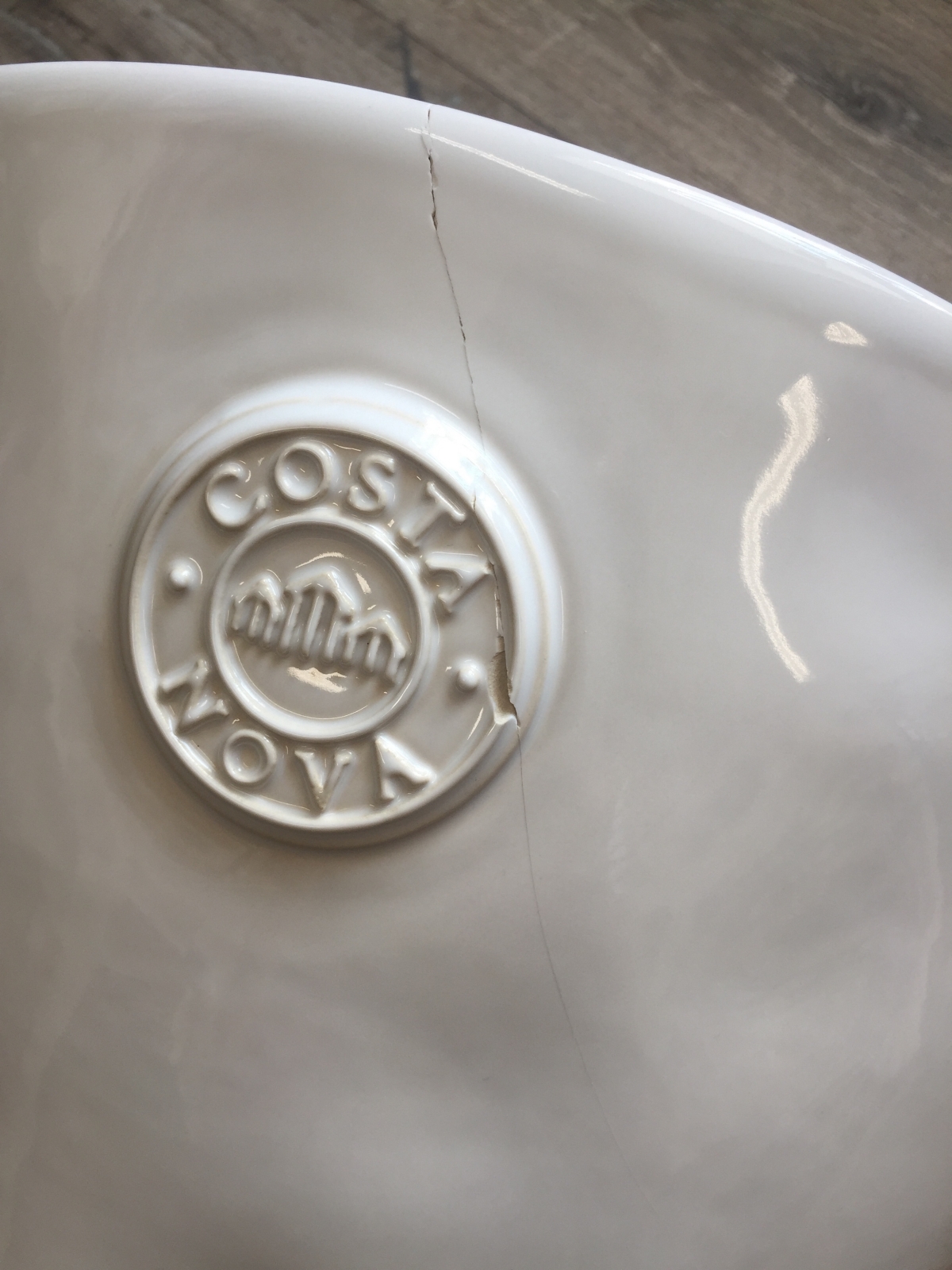 Misa na šampanske Costa Nova je vyradená z dôvodu praskliny. Poškodenie nebráni používaniu a misa sa môže naďalej používať na svoj účel alebo môže slúžiť ako obal / kvetináč na kyticu.