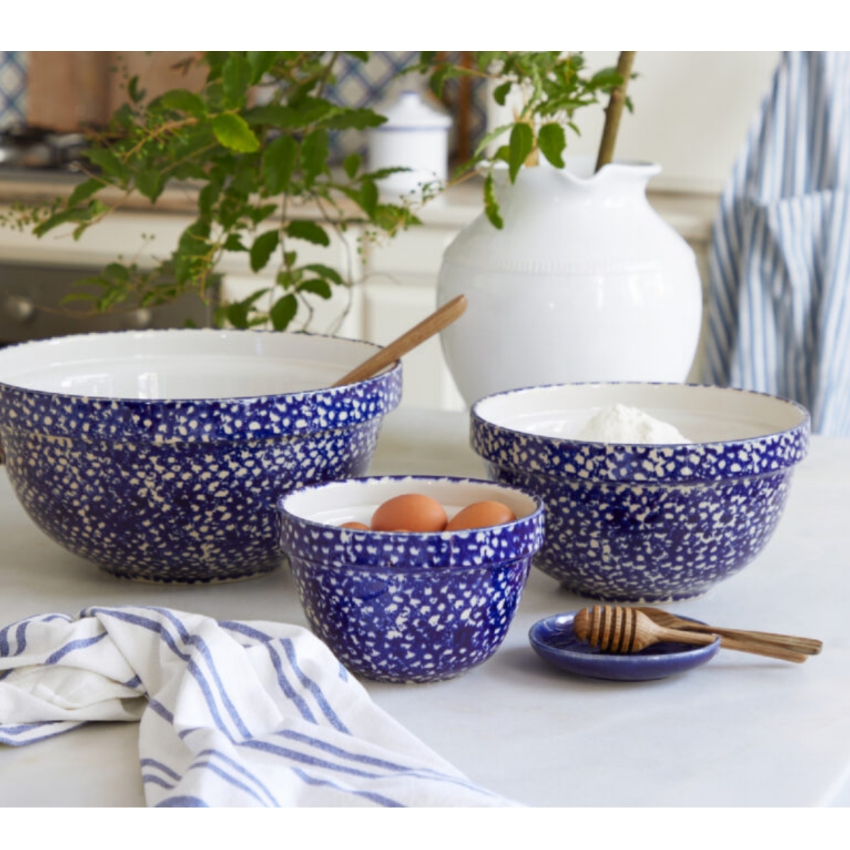 Vnútri je táto veľká misa biela a z vonkajšej strany ju zdobí vskutku krásna modro-biela glazúra. Tá vytvára na celom jej povrchu jemný vzor, podobný abstraktnej krajke. Zaobstarajte si celú trojdielnu sadu a vybavte prakticky a štýlovo svoju kuchyňu! Kombinovať ju je možné aj s ďalšími kúskami z kolekcie ABBEY.