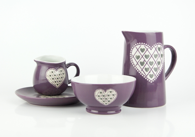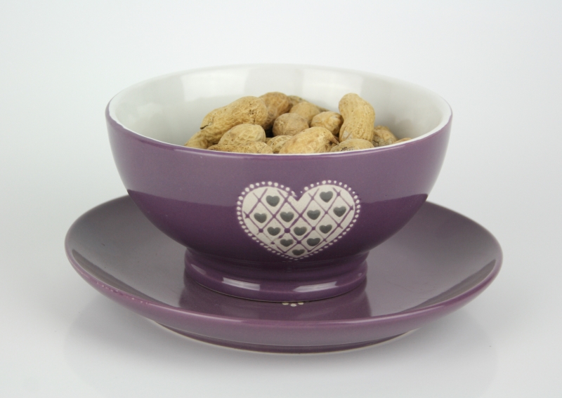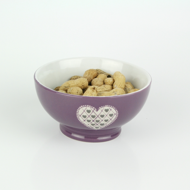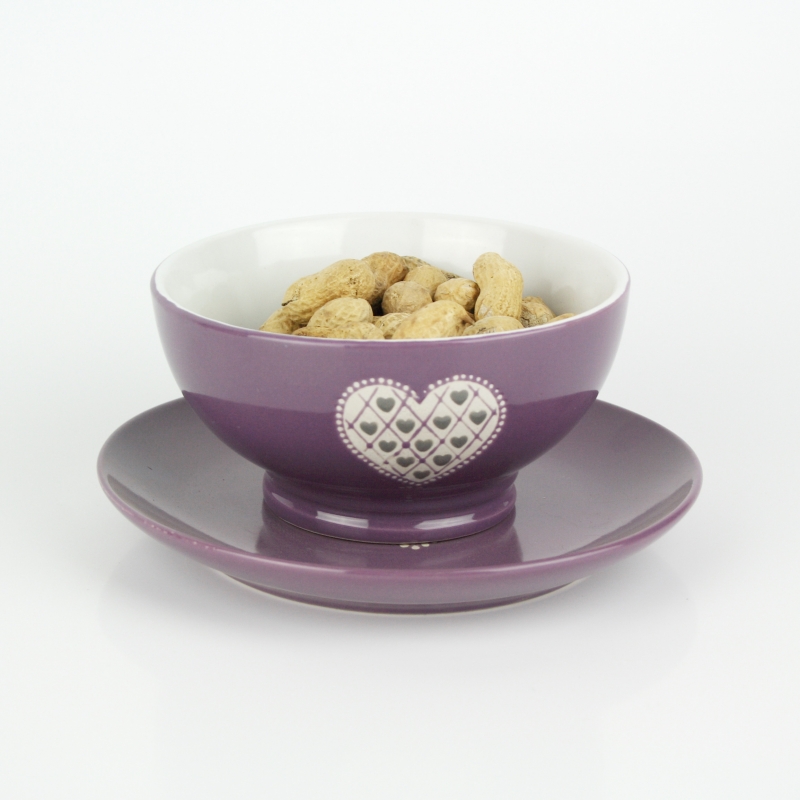 Miska má krásnu levanduľovú farbu a je ručne zdobená. Prednú stranu zdobí motív srdce. Miska je veľmi praktická, môžete v nej servírovať polievku, cereálie s mliekom alebo napríklad oriešky.