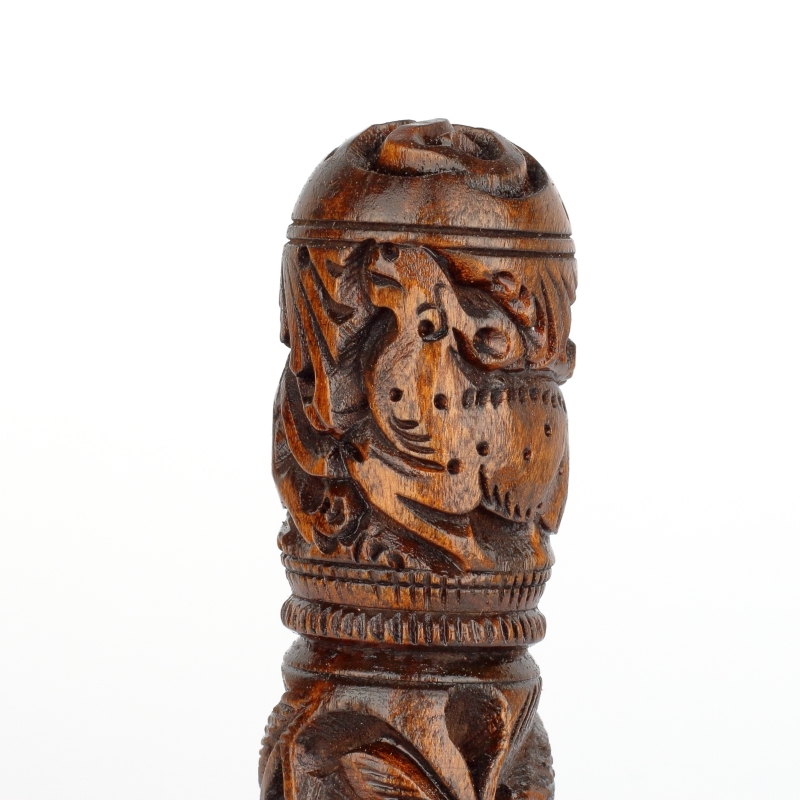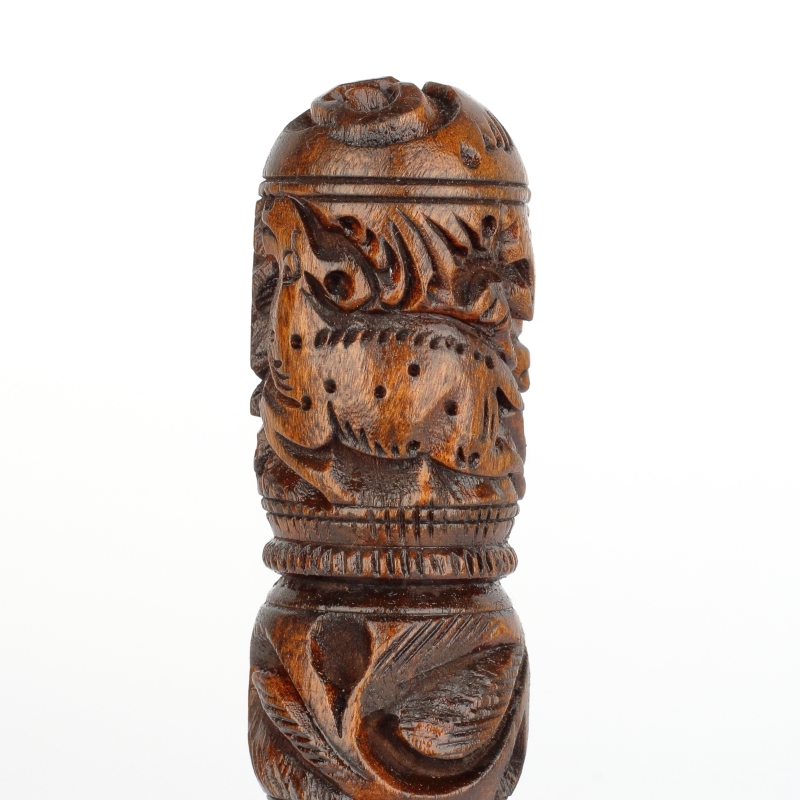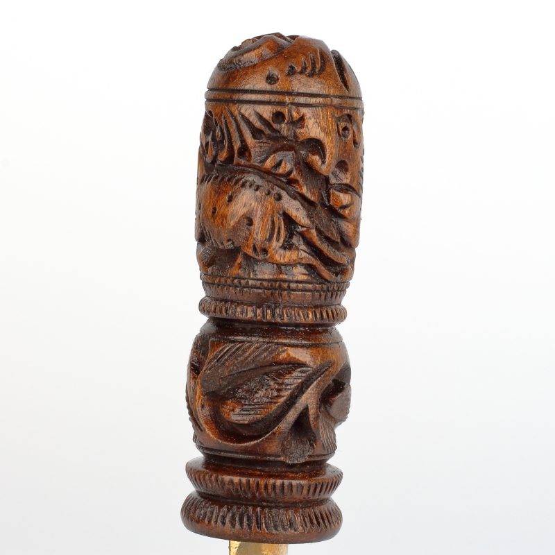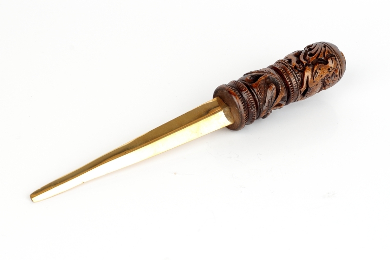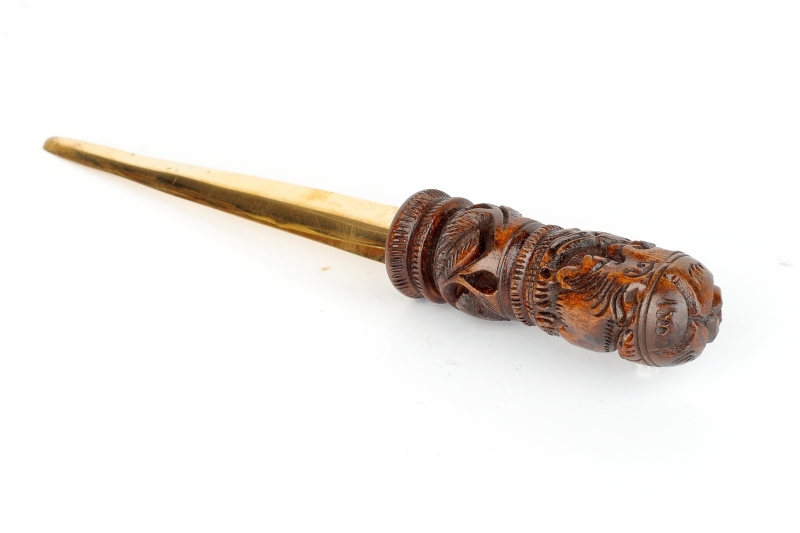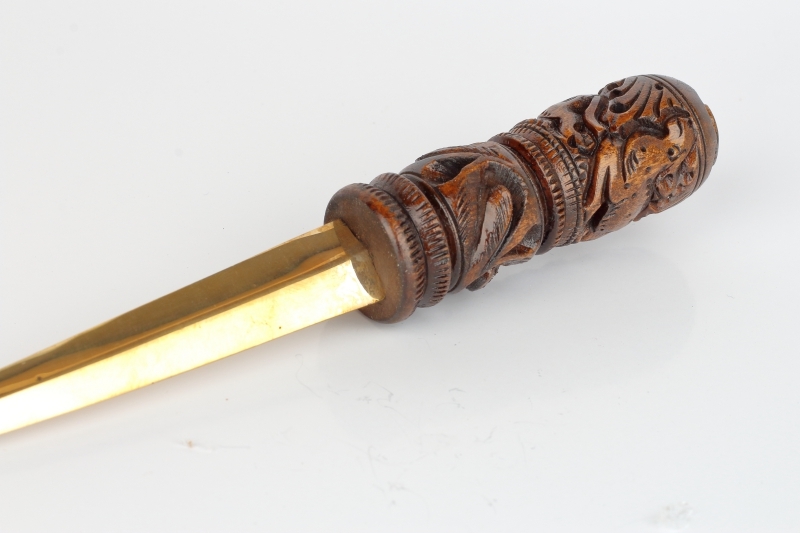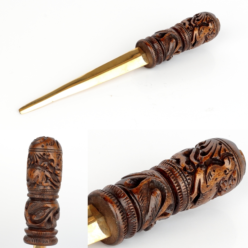 Otvárač na dopisy má ručne vyrezávanú drevenú rukoväť.
