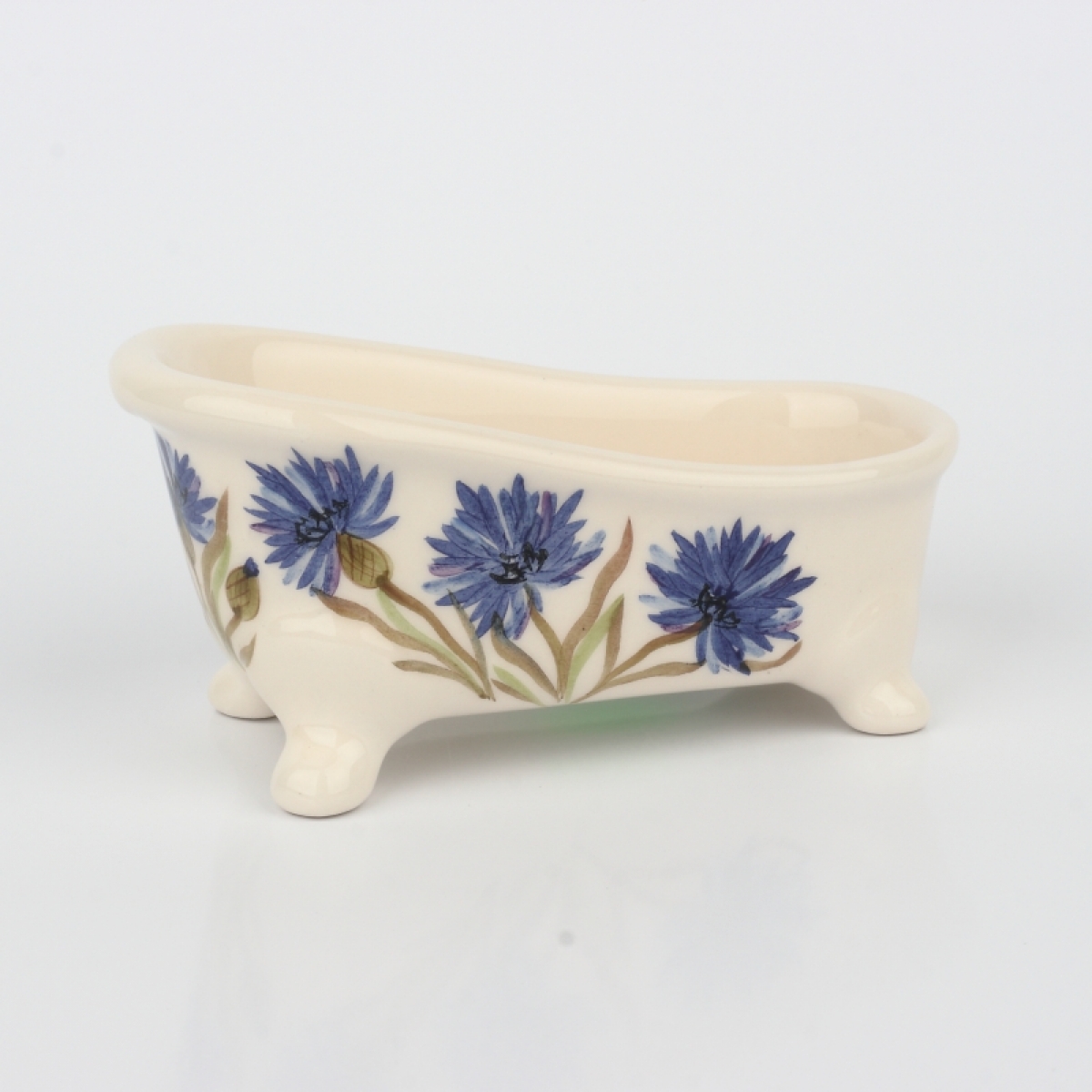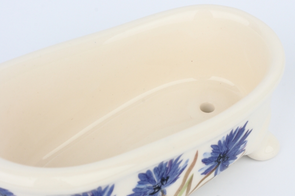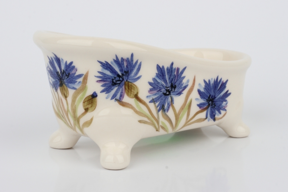 Keramická mydelnička s maľbou kvetov nevädze je ako stvorená do vidiecky ladené kúpeľne. Kvetinový motív perfektne oživí často nudné kúpeľňové obklady a bude výborne slúžiť. Má aj odtokovú dieru na vodu, takže mydla dlho vydrží.