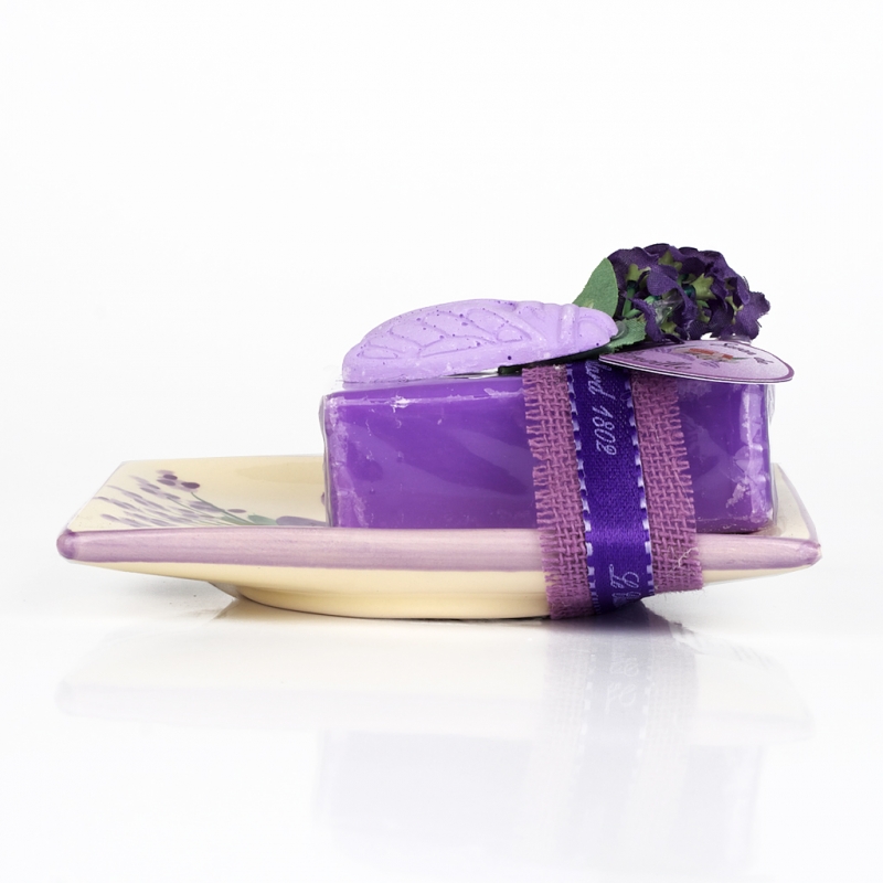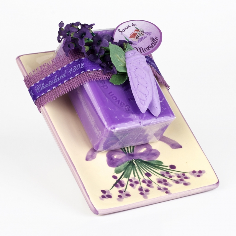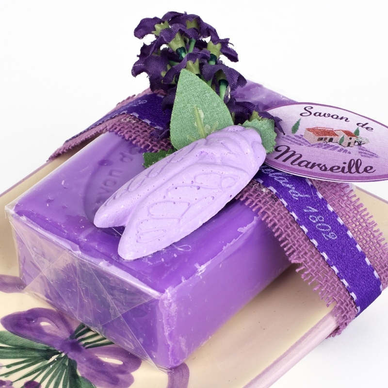 Balení obsahuje originální Savon de Marseille toaletní mýdlo 100g , se stylovou keramickou mýdlenkou (mašlička, kytička levandule a včelka pro dokrášlení tohoto překrásného dárku).