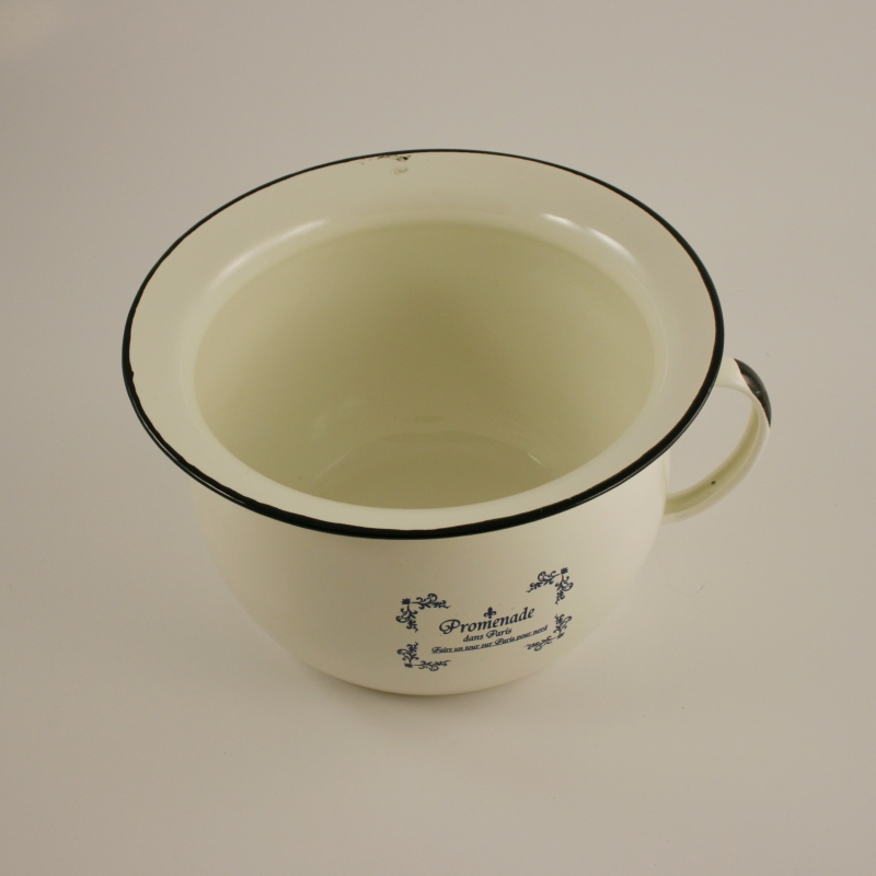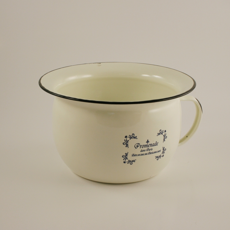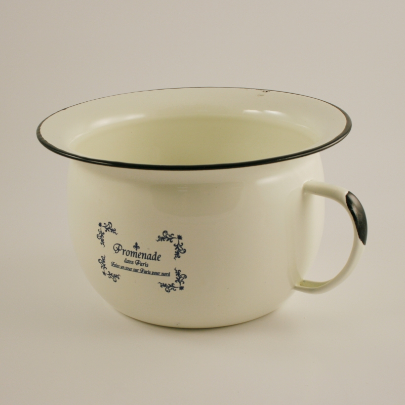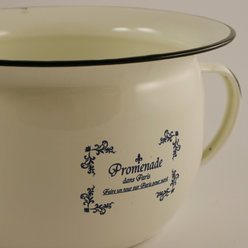 Nádoba Promenade je biela smaltovaná nádoba s uškom . Predná časť zdobí nápisy a ornamenty vykonané výraznou modrou farbou .