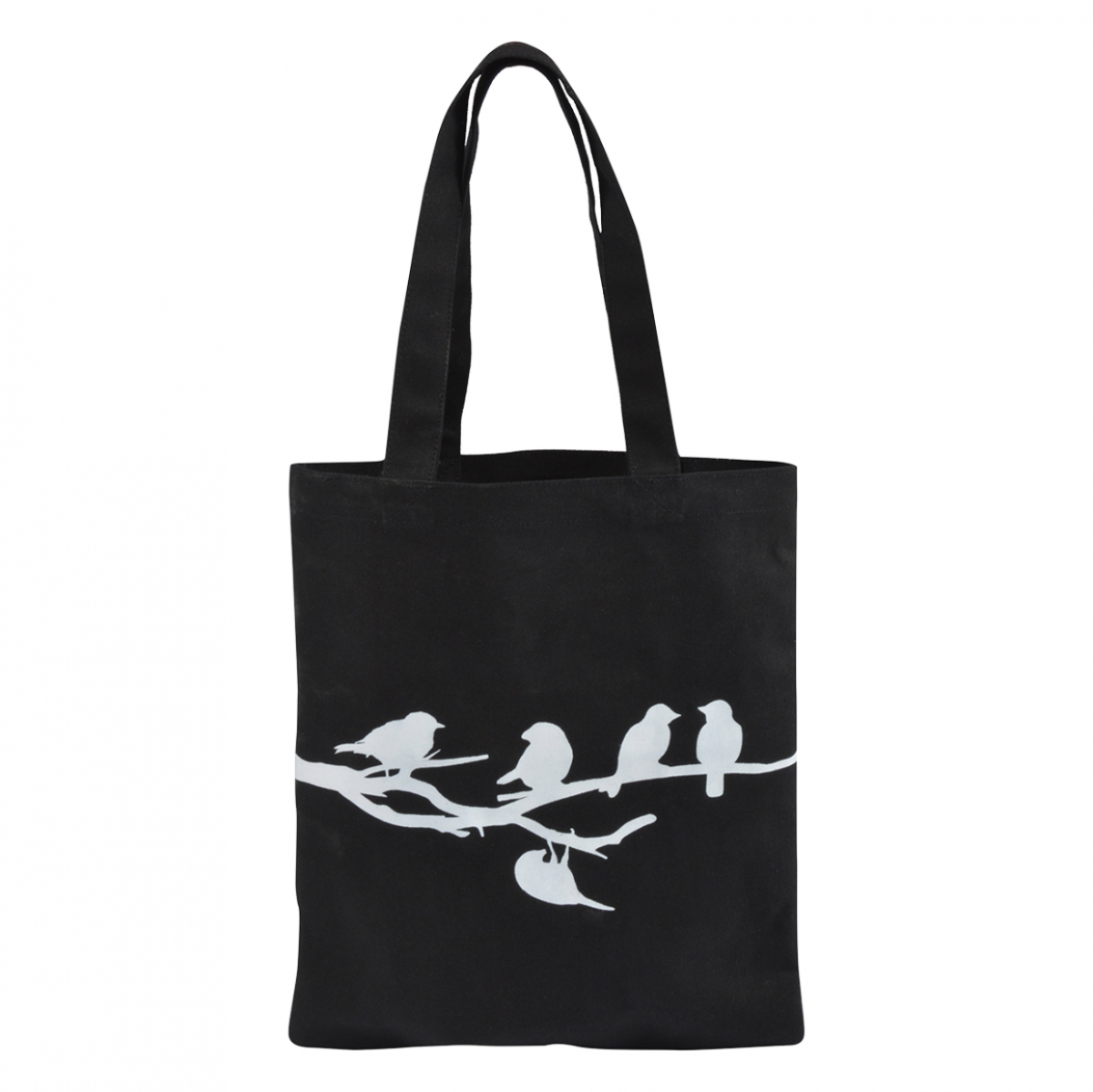 Na čiernom plátne je bielo natlačená silueta momentky, zobrazujúci päť vtáčikov na vetvičke. Bielo čierna farebná kombinácia, spoločne s prírodným motívom, povyšuje túto nákupnú tašku na štýlový módny doplnok.