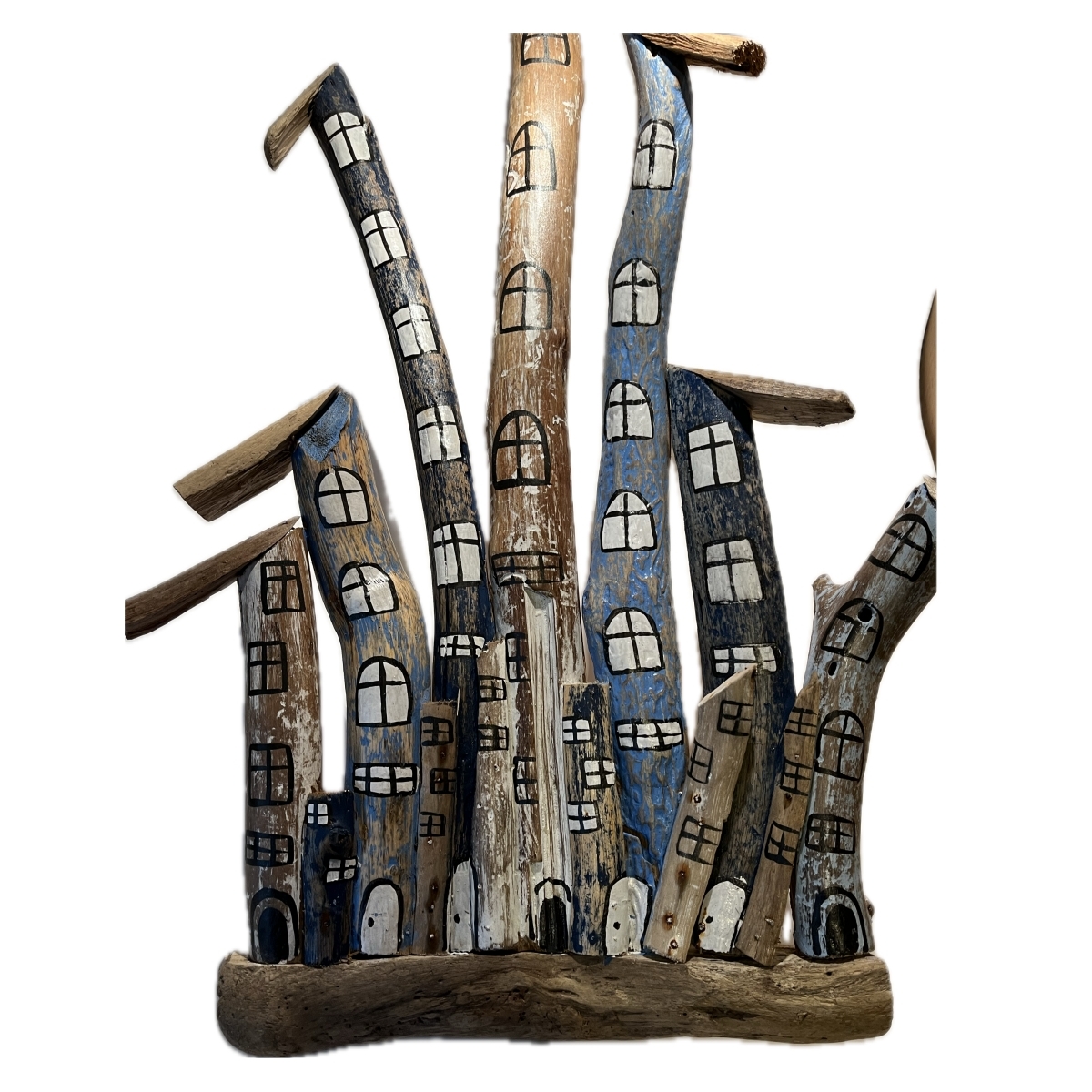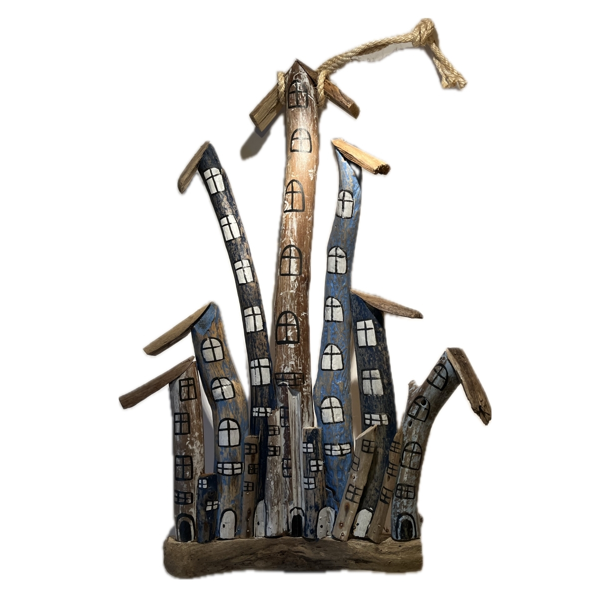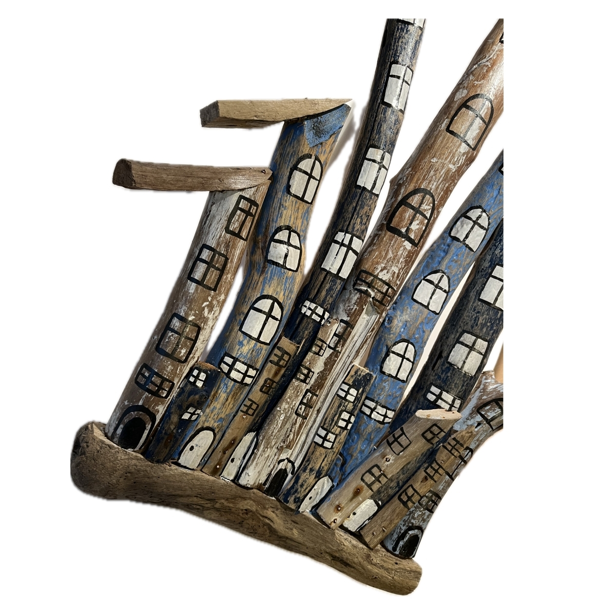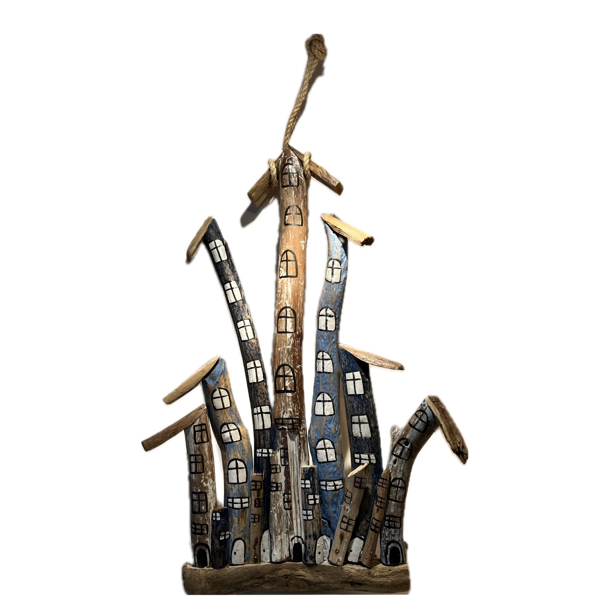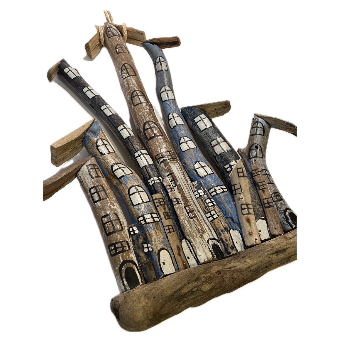 Nástenná dekorácia z náplavového dreva, v podobe ručne maľovaných domčekov so strieškou av spodbnej časti s vchodovými dverami.