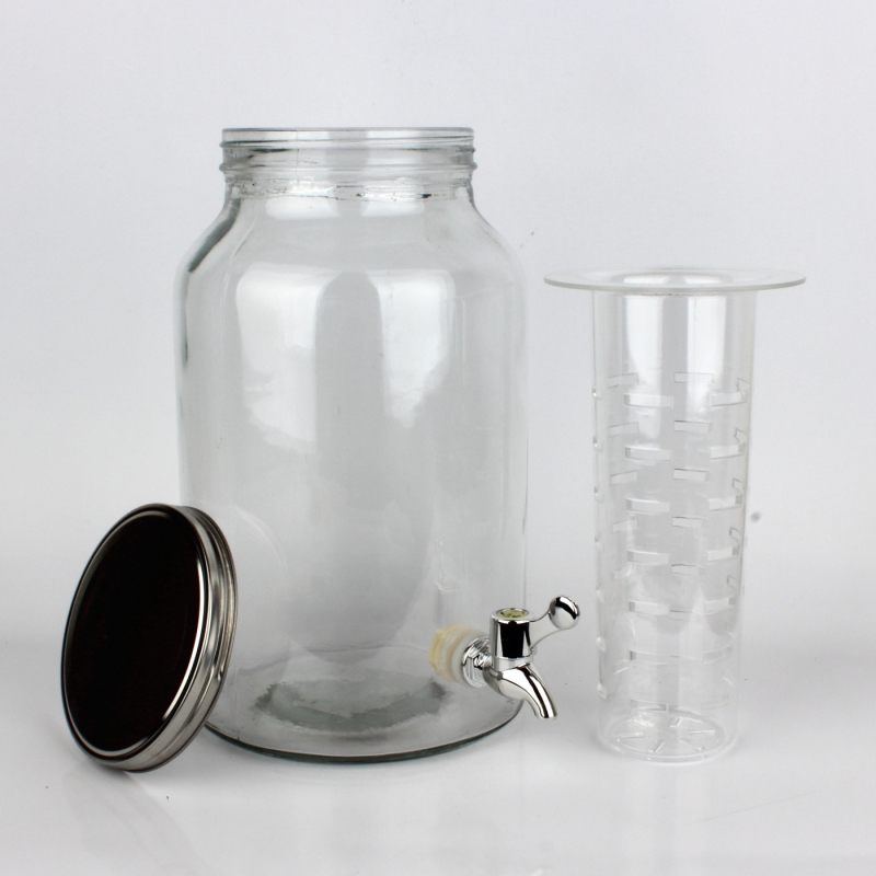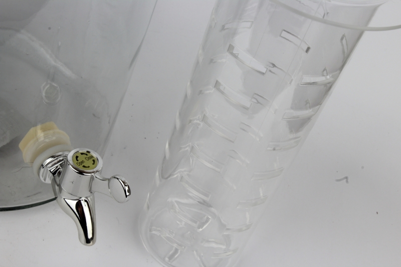 Dóza je z číreho skla, kovové veko je skrutkovacie, kohútik (tvrdený plast s povrchovou úpravou) má tesnenie, plastový filter je možné jednoucho z nádoby vybrať.