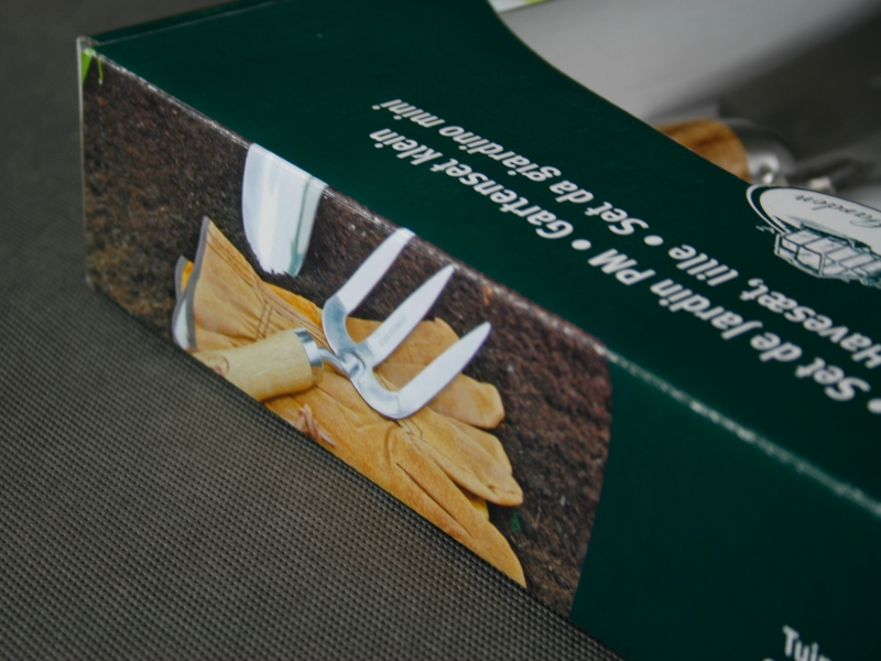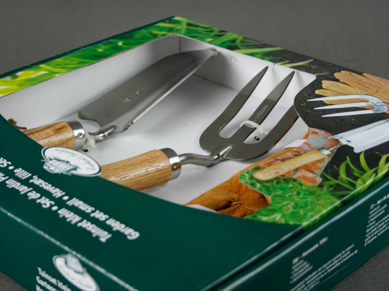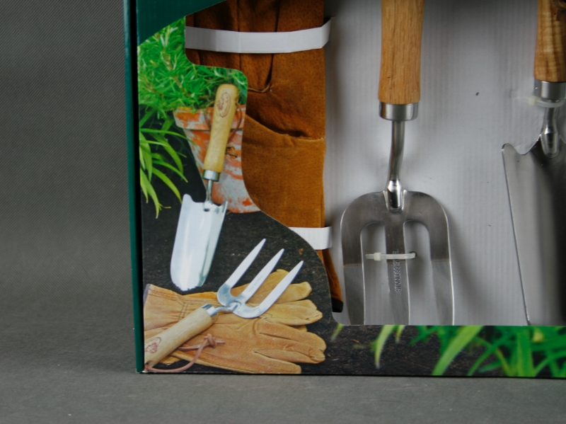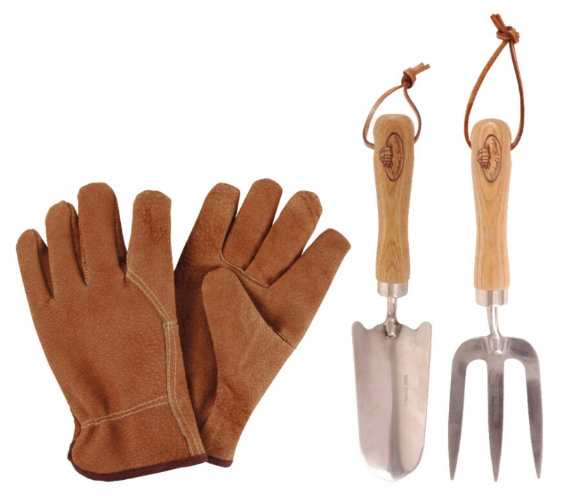 Čepel náradie je vyrobené z vysoko kvalitných nerezových ocelí vo striebornom designu s rukoväťou z jasanového dreva, opatrenou koženým pútkom pre zavěšení. Kožené záhradné rukavice sú vyrobené z prepracovanej kože vo svetlom hnedom dizajne s lemovaním.