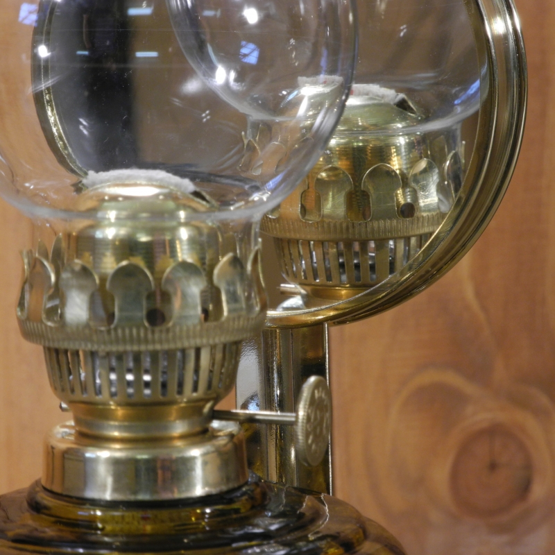 Petrolejová lampa so zrkadlom má rám z mosadzného plechu, ktorý krásne dopĺňa sklenenou nádržku na petrolej v dymovej farbe.
