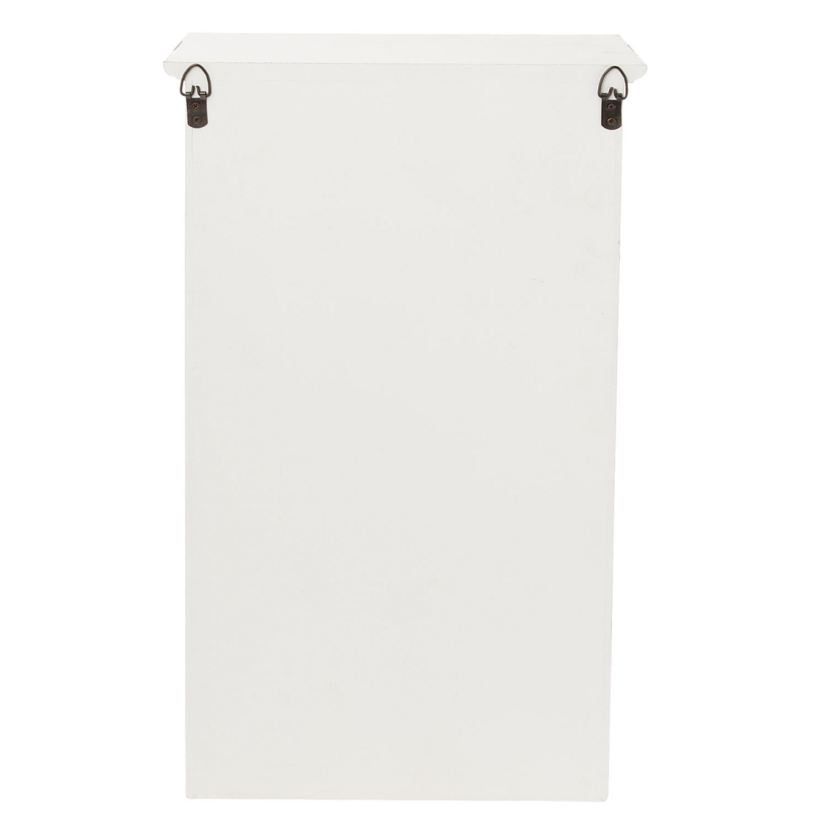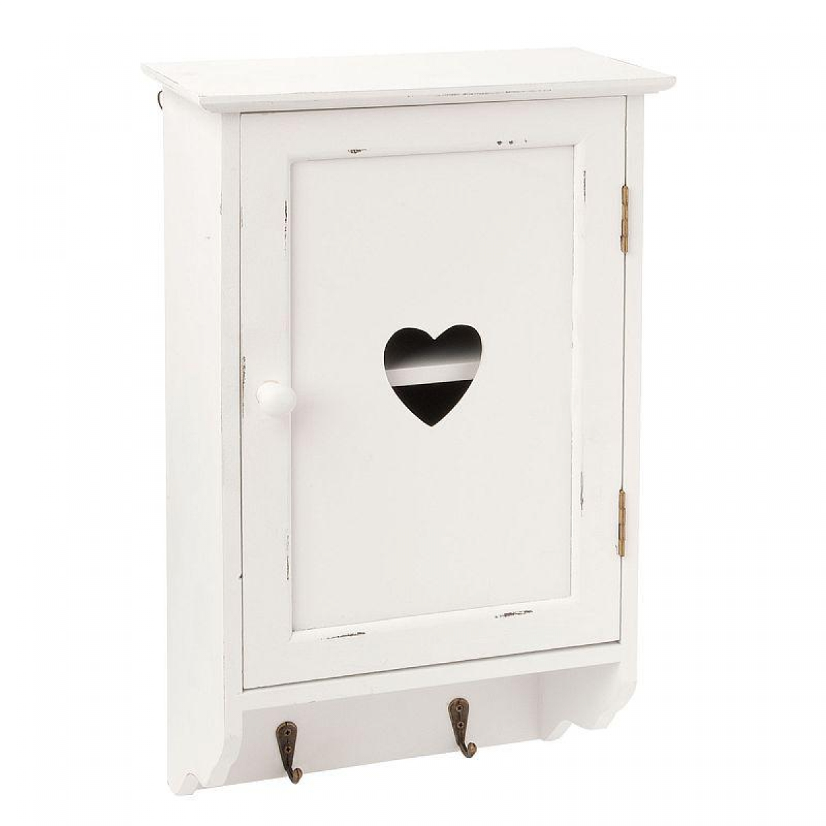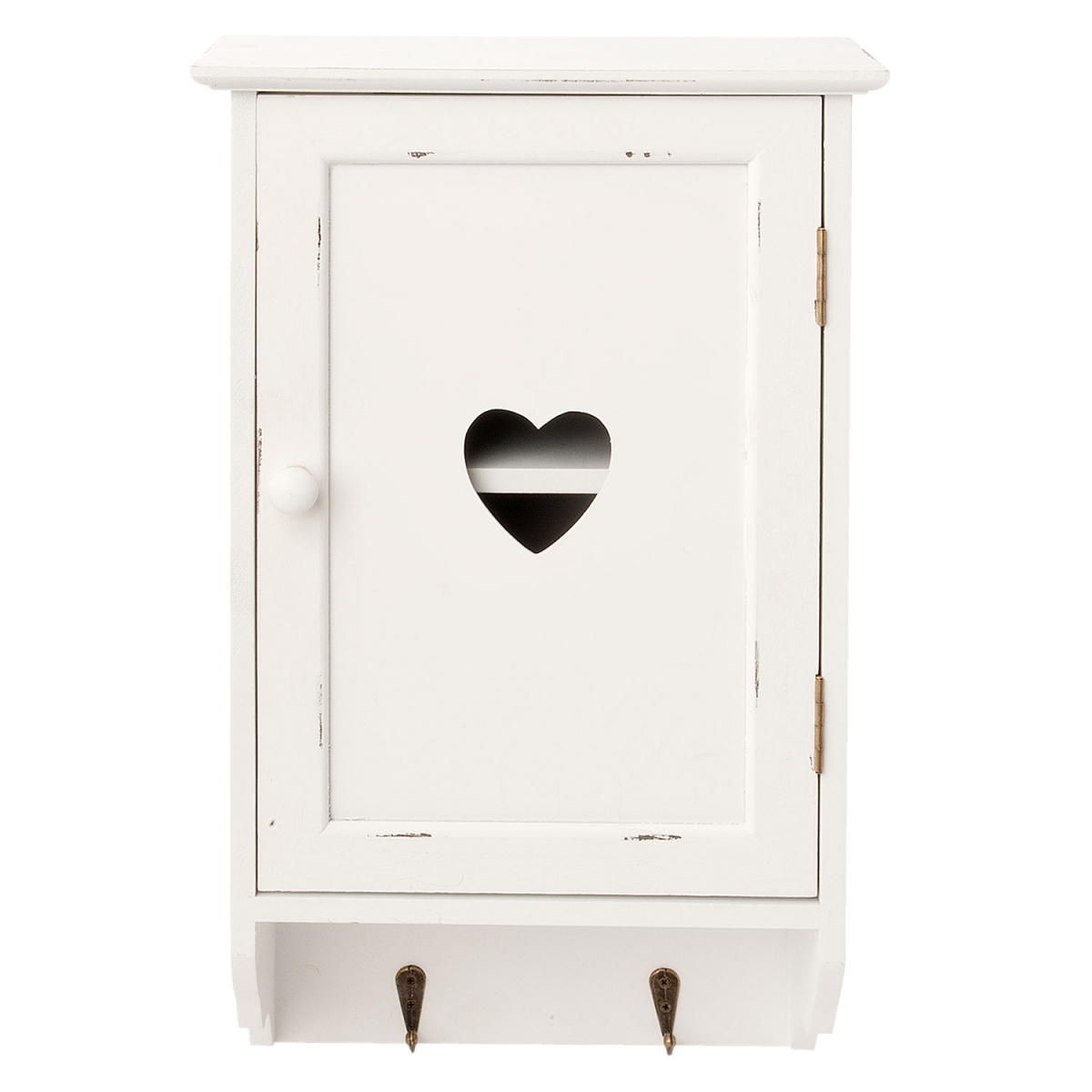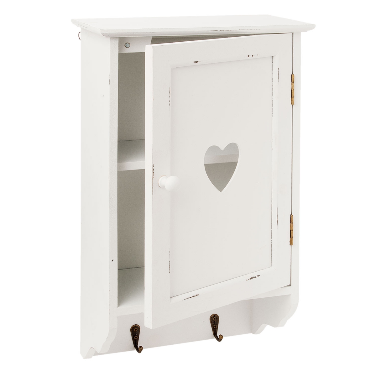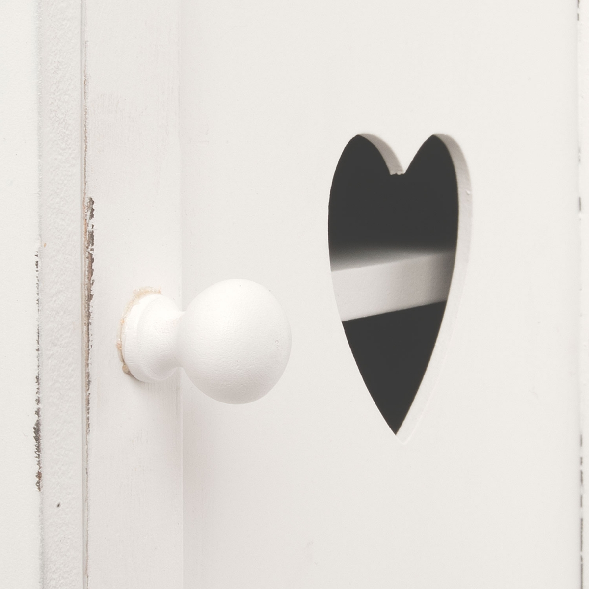 Dvierka majú otvor v tvare srdca, ktorý dodáva tomuto malému kusu nábytku vidiecky nádych. Zatváranie je na magnet a na zadnej strane má skrinka háčiky na zavesenie.