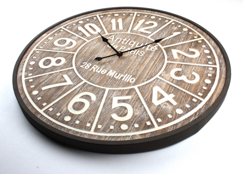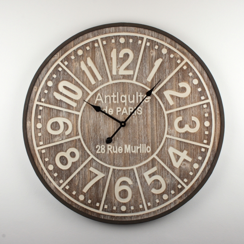 Nástenné guľaté vintage hodiny Antiquia de Paris 80cm z dreva s krásnou štruktúrou a pitnú na povrchu.