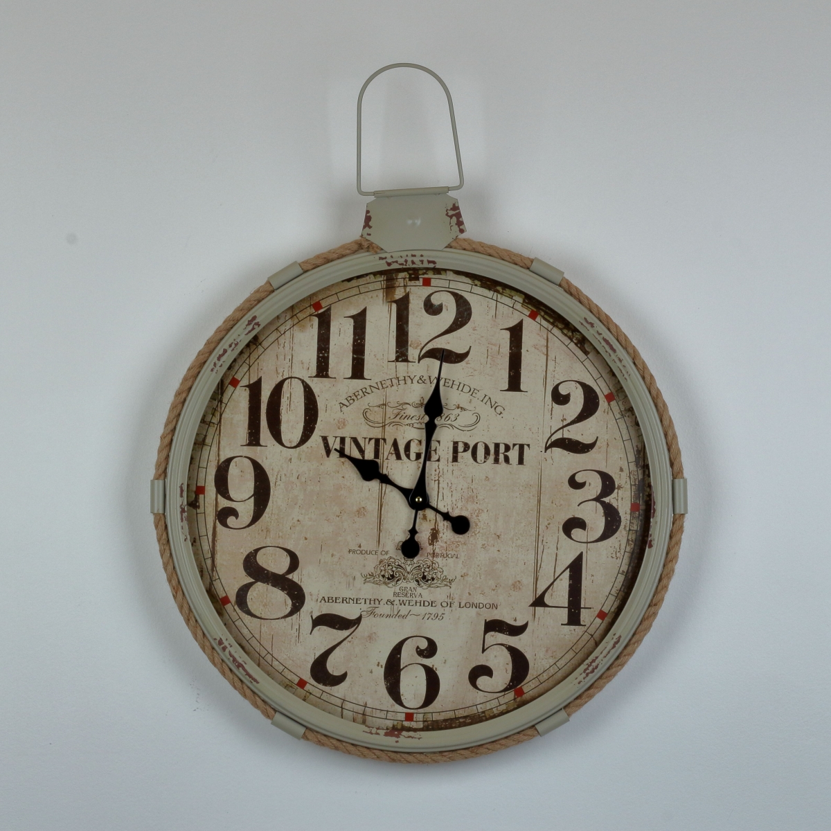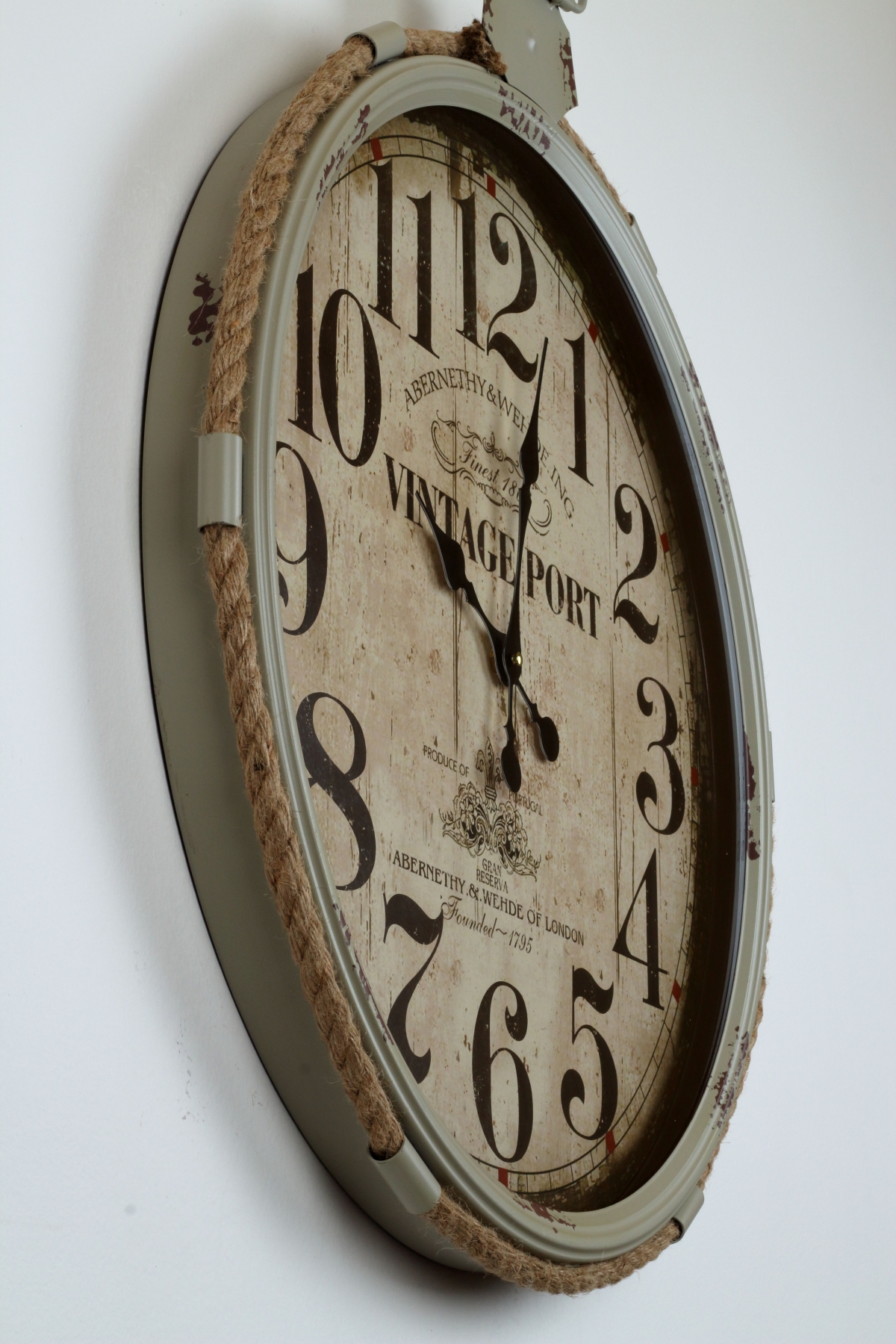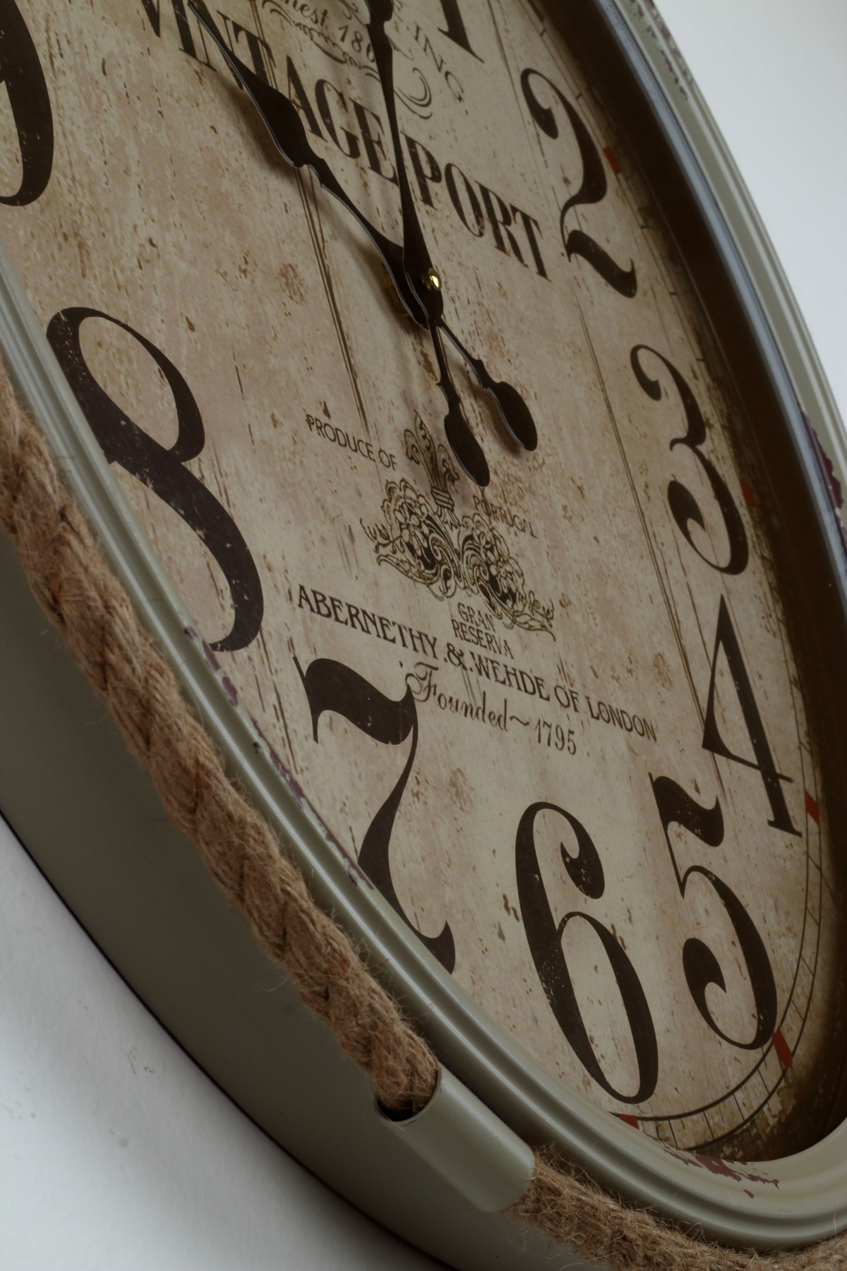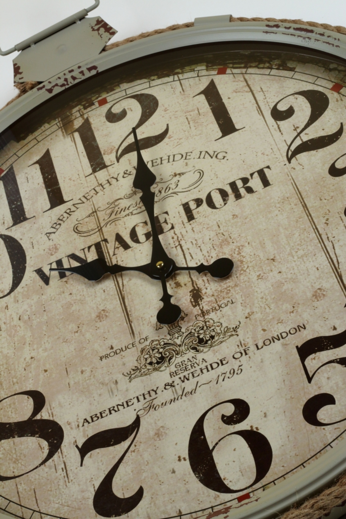 Hodiny lemuje povrazové lano a stred ciferníku je doplnený o nápisy.