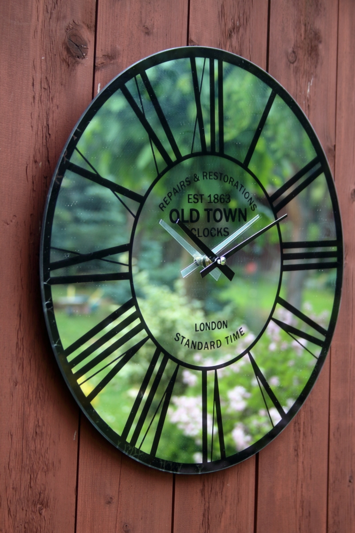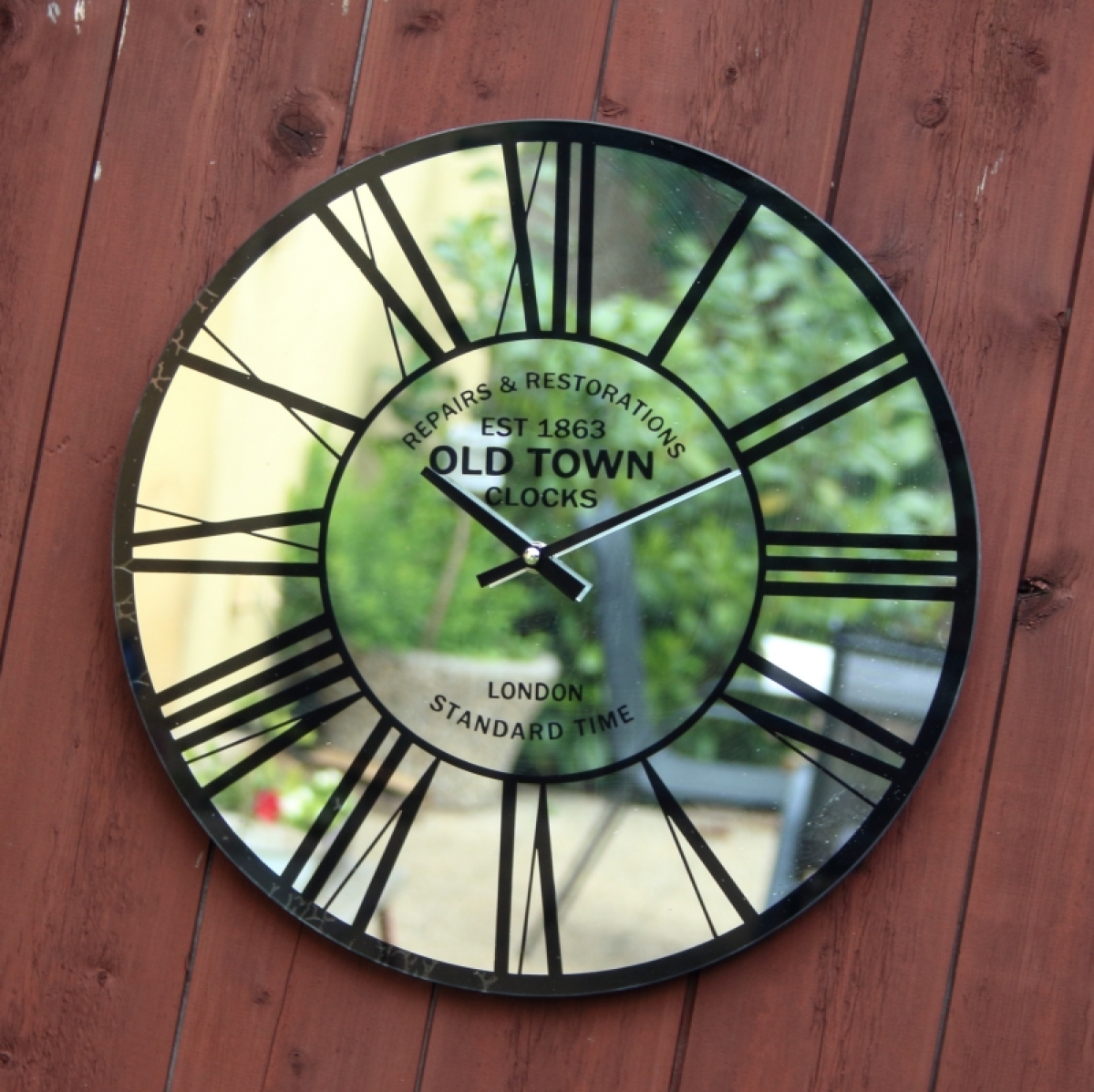 Nástenné hodiny s nápisom Old Town s rímskymi číslicami, na zrkadle.