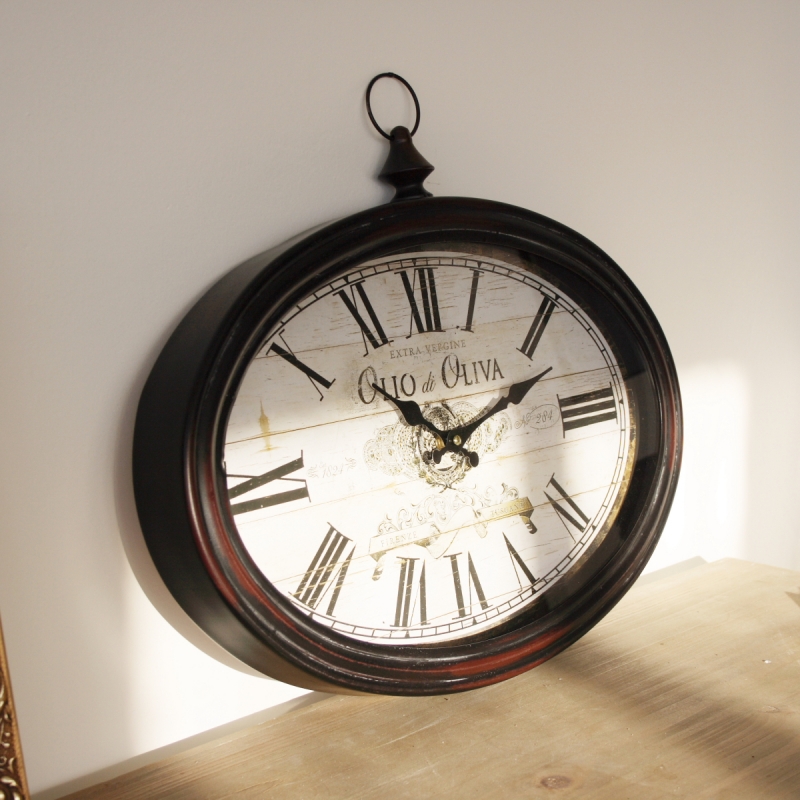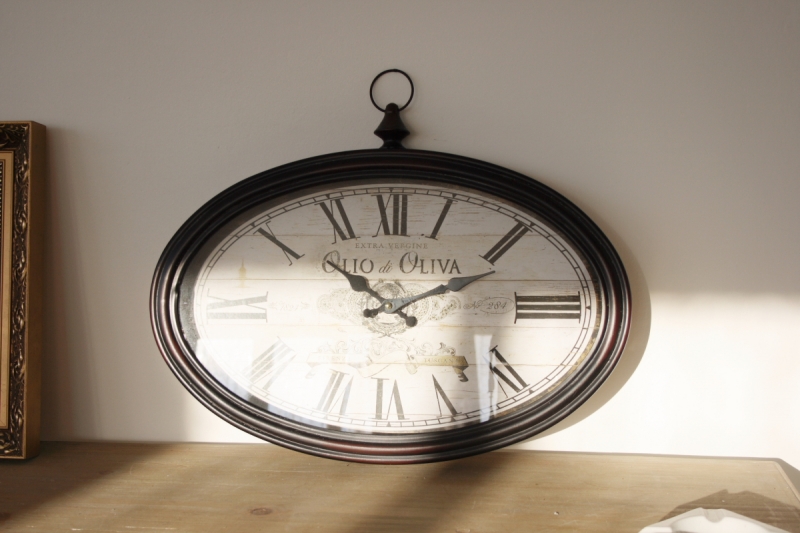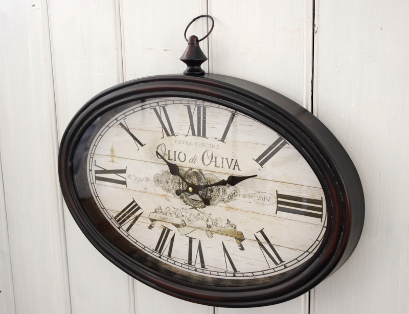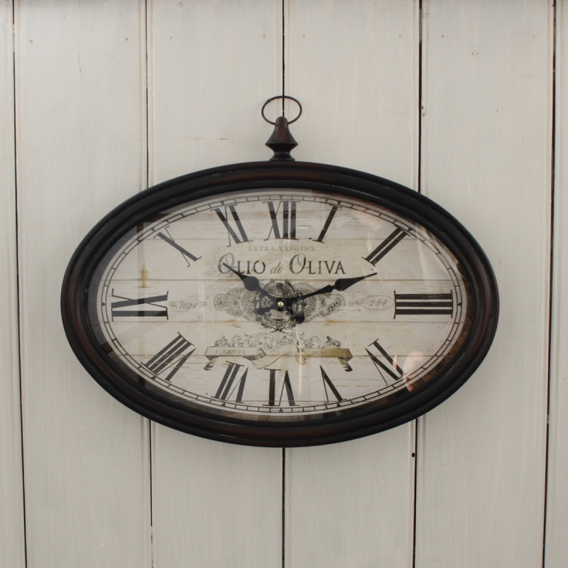 Nádherné kovové hodiny oválneho tvaru majú vintage ciferník s nápismi týkajúce sa extra panenského olivového oleja. Sú vhodné ako dekorácia do kuchyne či jedálne.