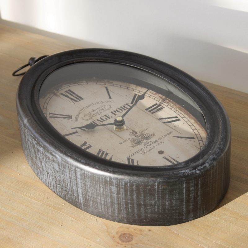 Nástenné hodiny oválne Vintage Port zdobené výraznou patinou a otlčeným vzhľadom ciferníku. Hodiny sú kovové, zasklenné, s rímskymi číslicami. Ako by patrili na stenu v malej kaviarni uprostred Londýna.