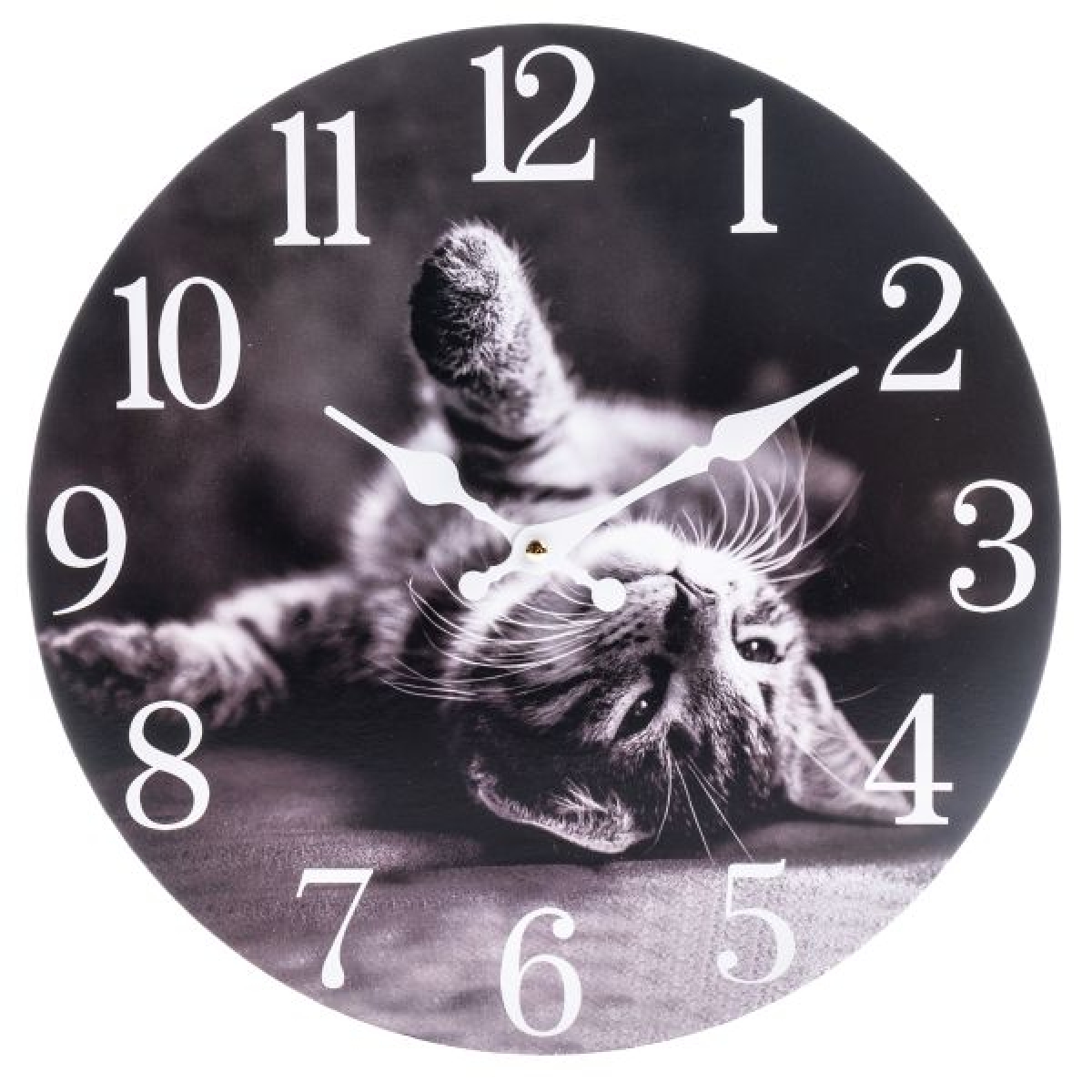 Nástenné hodiny s moitívom odpočívajúcej mačky potešia všetkých milovníkov domácich maznáčikov.