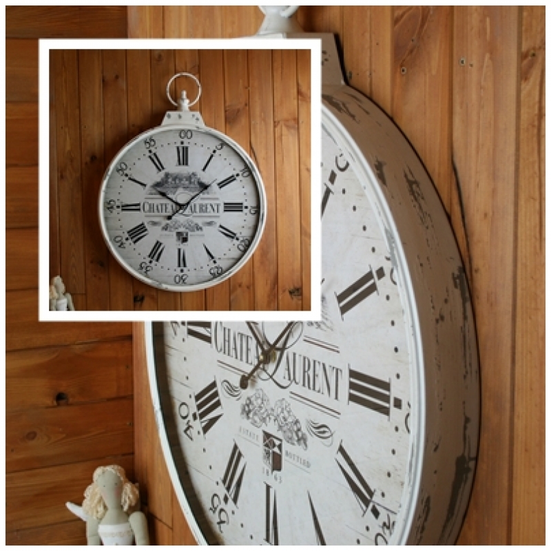 Nástenné hodiny s bielym kovovým rámom, ktorý pôsobí otlčeným vzhľadom. Hodiny majú veľké zreteľné číslice, ktoré rozpoznáte aj z veľkej diaľky. Svetlý podklad ciferníku necháva krásne vyniknúť číslice a zdobenie v stredu hodín. Je tu vyobrazený francúzsky zámoček Chateau St Laurent.