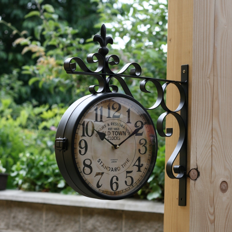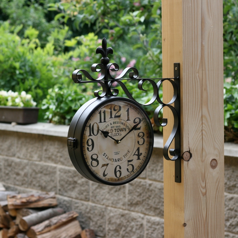 Nástenné obojstranné hodiny majú prekrásne riešený ciferník s veľkými čitateľnými číslicami. Vďaka nim bude zisťovanie času oveľa jednoduchšie. Hodiny sú súčasťou kovové konzolky, ktorú možno jednoducho dvoma skrutkami pripevniť k stene.