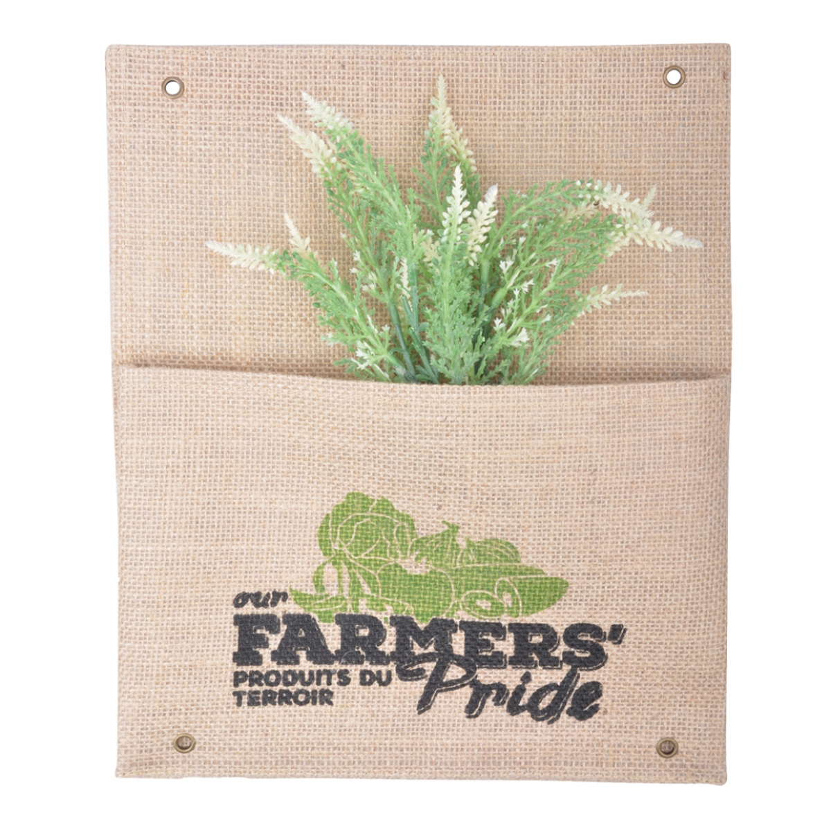 Nástenné vrecko možno zavesiť kamkoľvek, pomocou dvoch priechodiek v jej hornej časti. Je ušité z juty, krásneho prírodného materiálu. Jeho predná strana je potlačená logom FARMERS Pride, ktoré sa skladá zo zeleného zobrazenie zeleniny a čierneho nápisu.