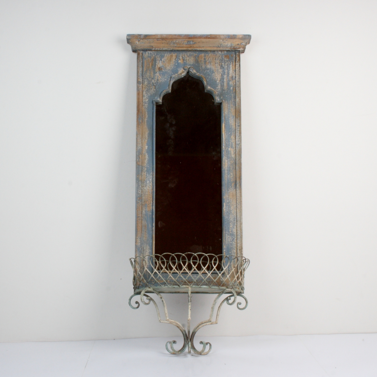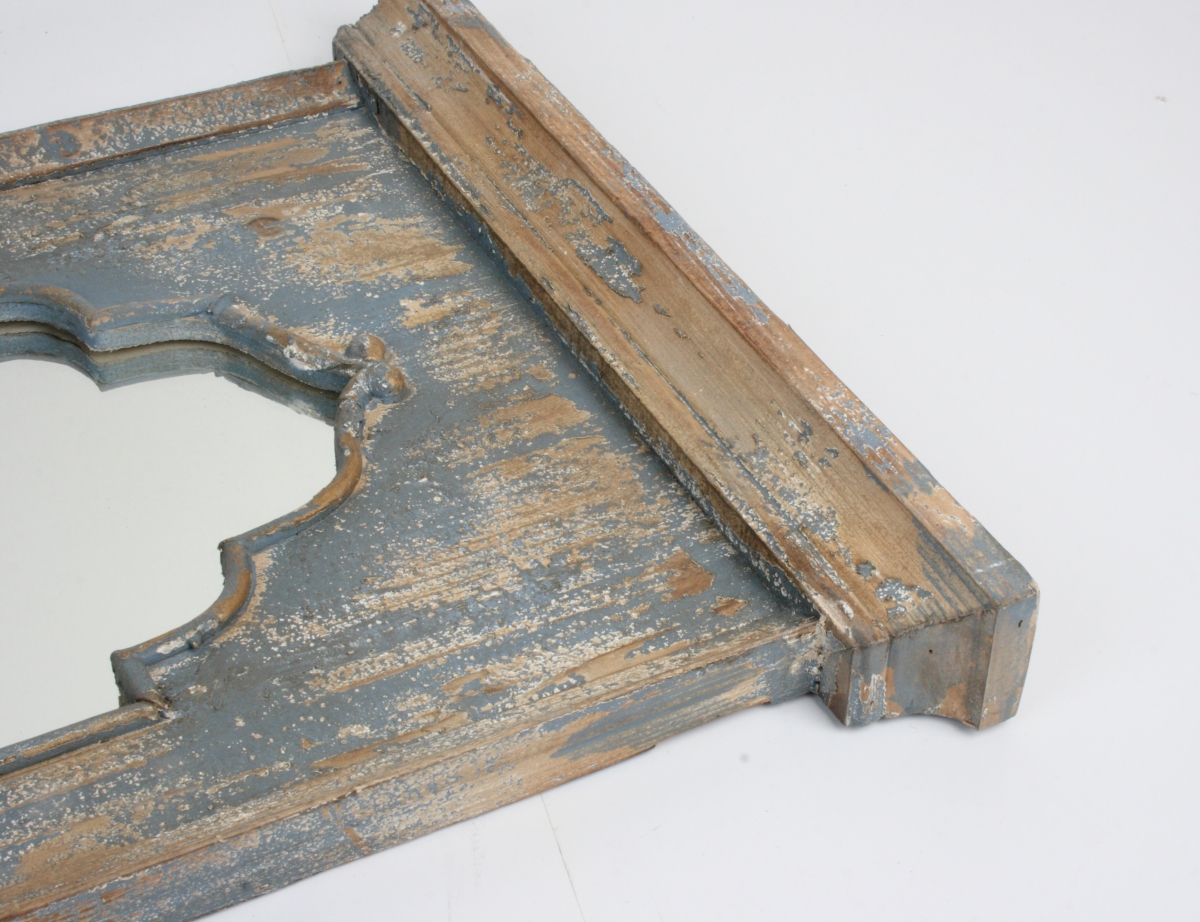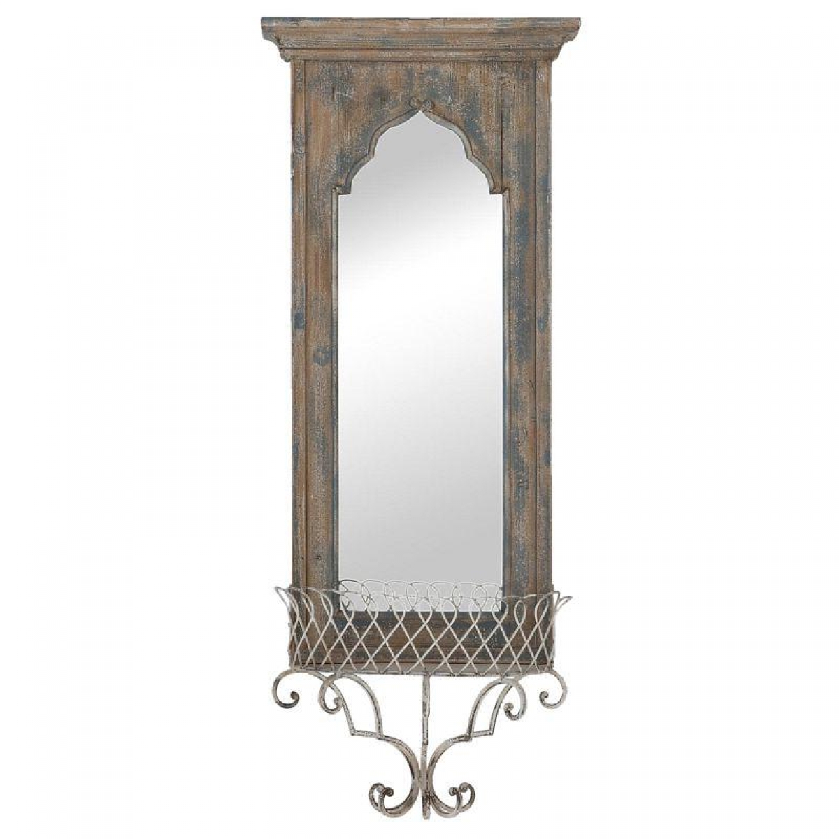 Nástenné zrkadlo sa zábradlím 42x16x105cm vyzerá ako práve nájdené na staré pôde. Ošumelá vzhľad, patina a nezvyklé riešenie kovové police pripomínajúce zábradlie robí zo zrkadla jedinečný dizajnový kúsok.