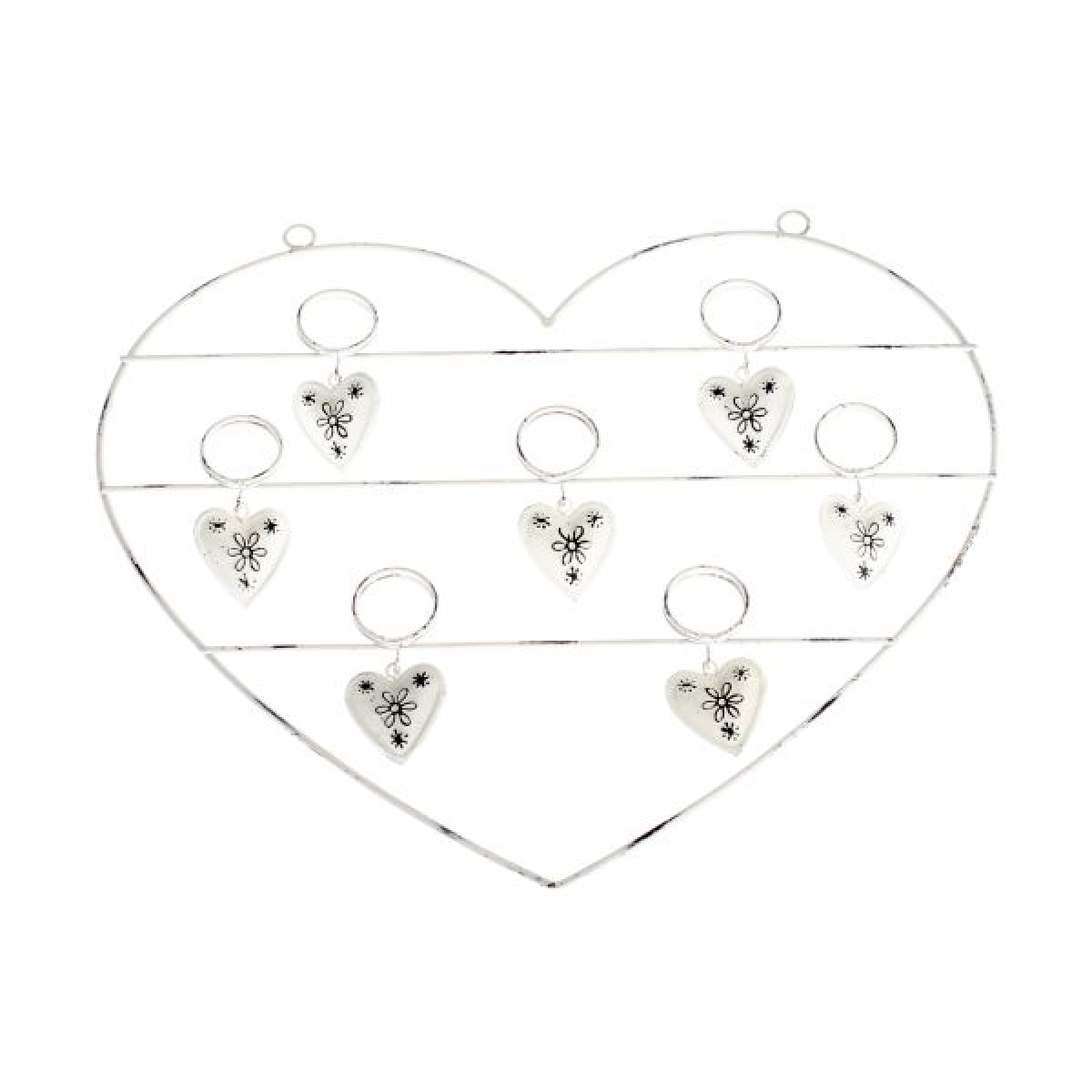 Nástenný držiak na fotografie tvorí veľké srdce, v ktorom sú tri drôtené linky, na ktorých nájdeme celkom sedem upevňovacích krúžkov na fotografie. Tie sa do nich iba ľahko zasunú. Každý krúžok je navyše ozdobený pekným srdiečkom, ktoré je pod ním zavesené.