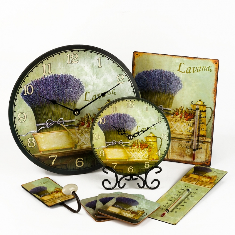 Bohatá kolekce levandule, nabízí doplnění sbírky o stylový teploměr, snídaňovou sadu, hrníčky, hodiny a magnetické tabule. Retro doplněk ke stylovému nábytku.