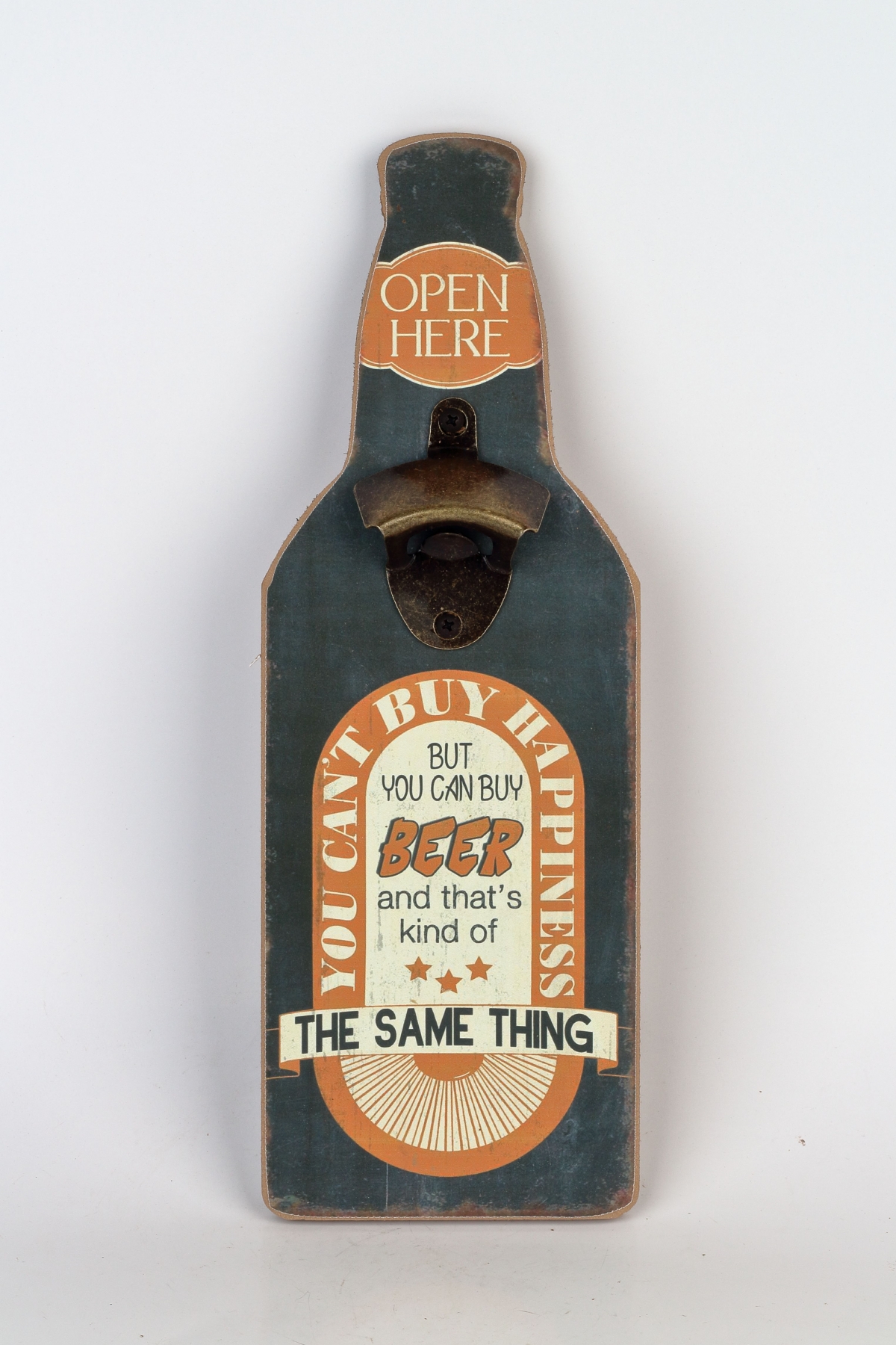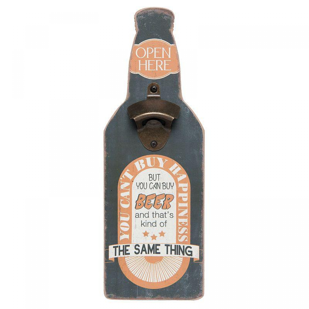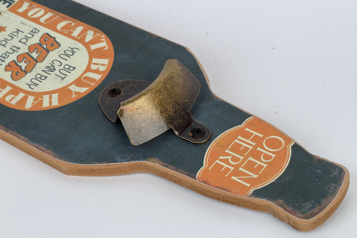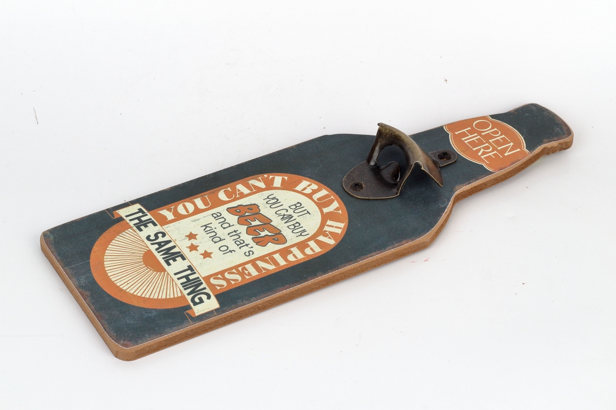 Doska v tvare fľaše je opatrená v hornej časti samotným kovovým otváračom na fľaše s korunkovými uzávermi a je ozdobená štýlovými retro nápisy.