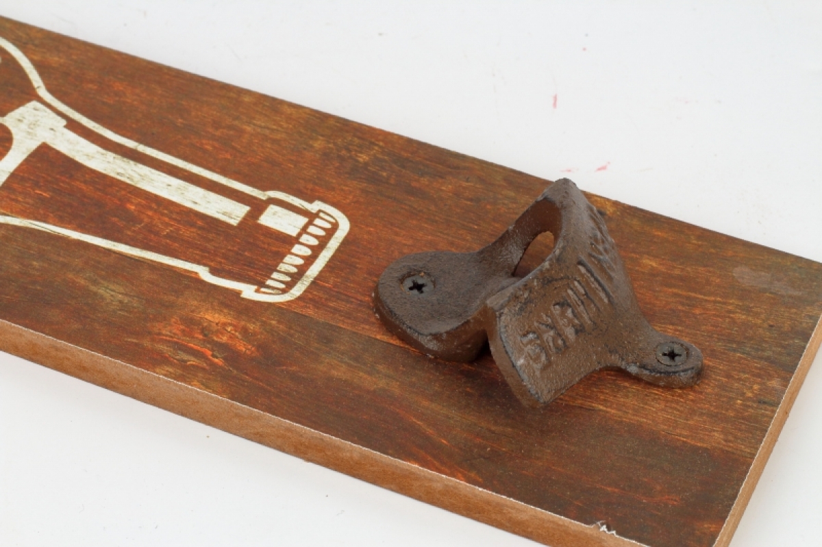 Doska v tvare fľaše je opatrená v hornej časti samotným kovovým otváračom na fľaše s korunkovými uzávermi a je ozdobená štýlovými retro nápisy.
