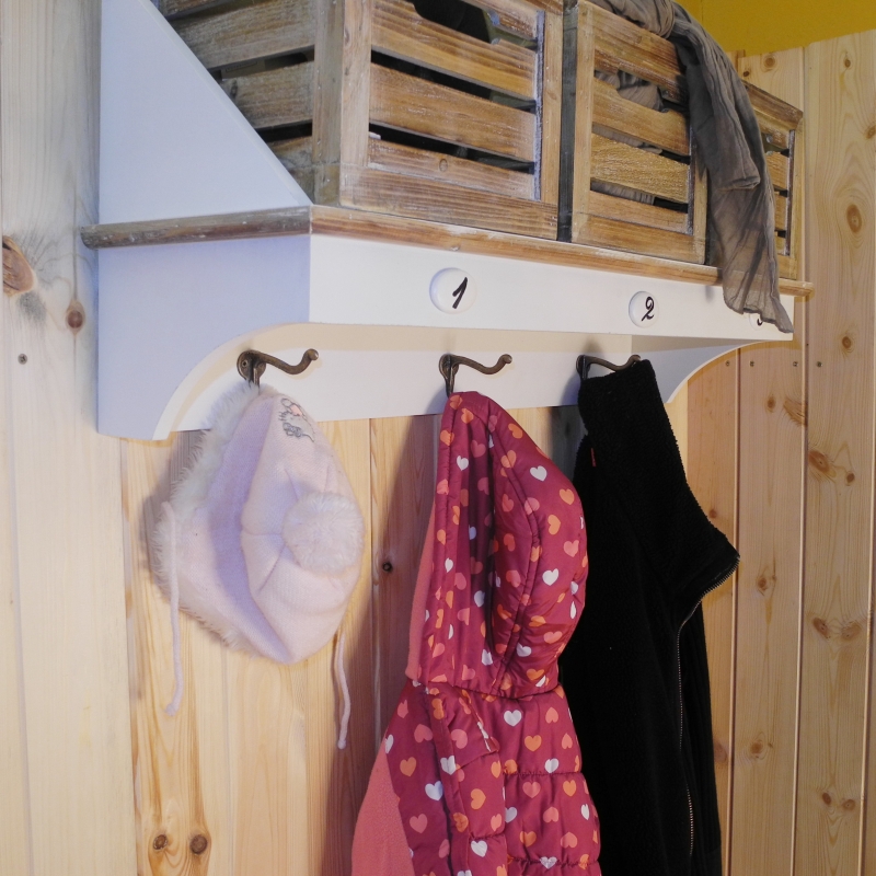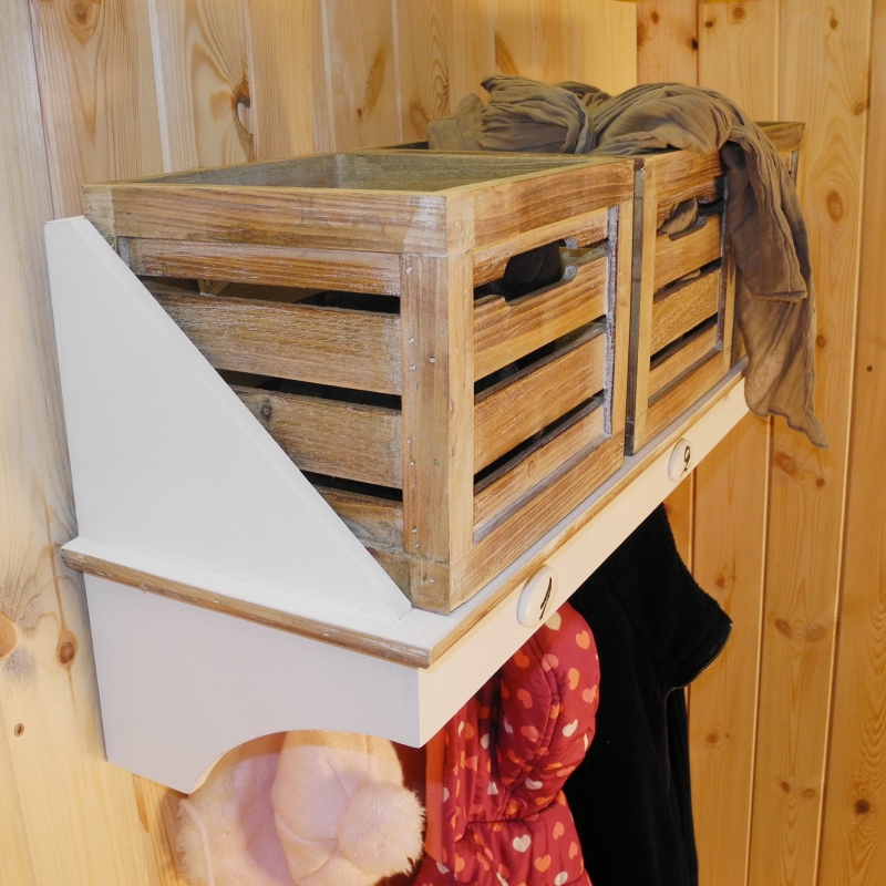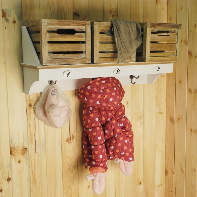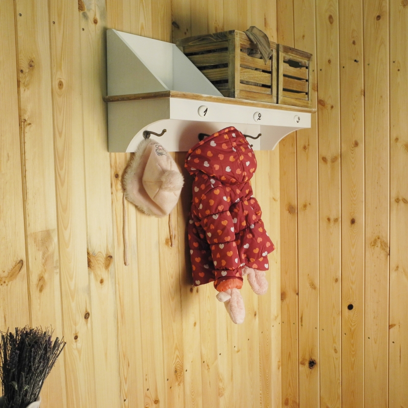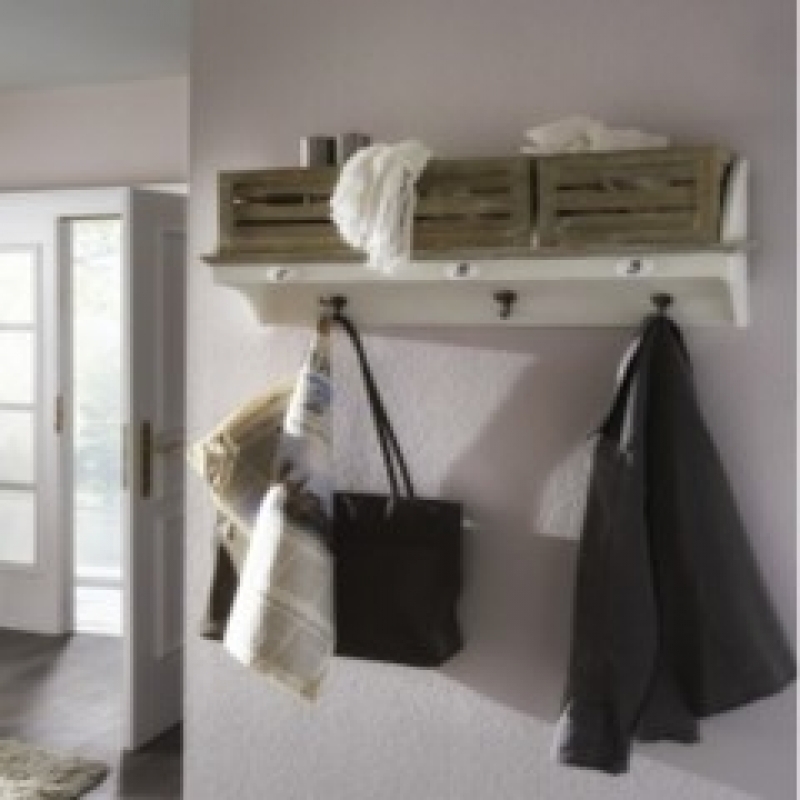 Je vyrobený z dreva a vytvára nádhernú kombináciu bielej a prírodnej farby tohto materiálu. Do troch boxov umiestnených na poličke umiestnite drobnosti, ktorých sa v predsieňach nájde dosť a dosť. V spodnej časti poličky nájdete tri praktické háčiky.