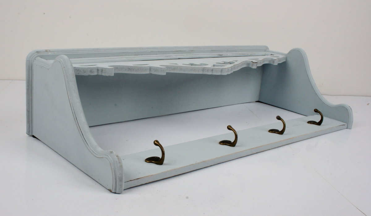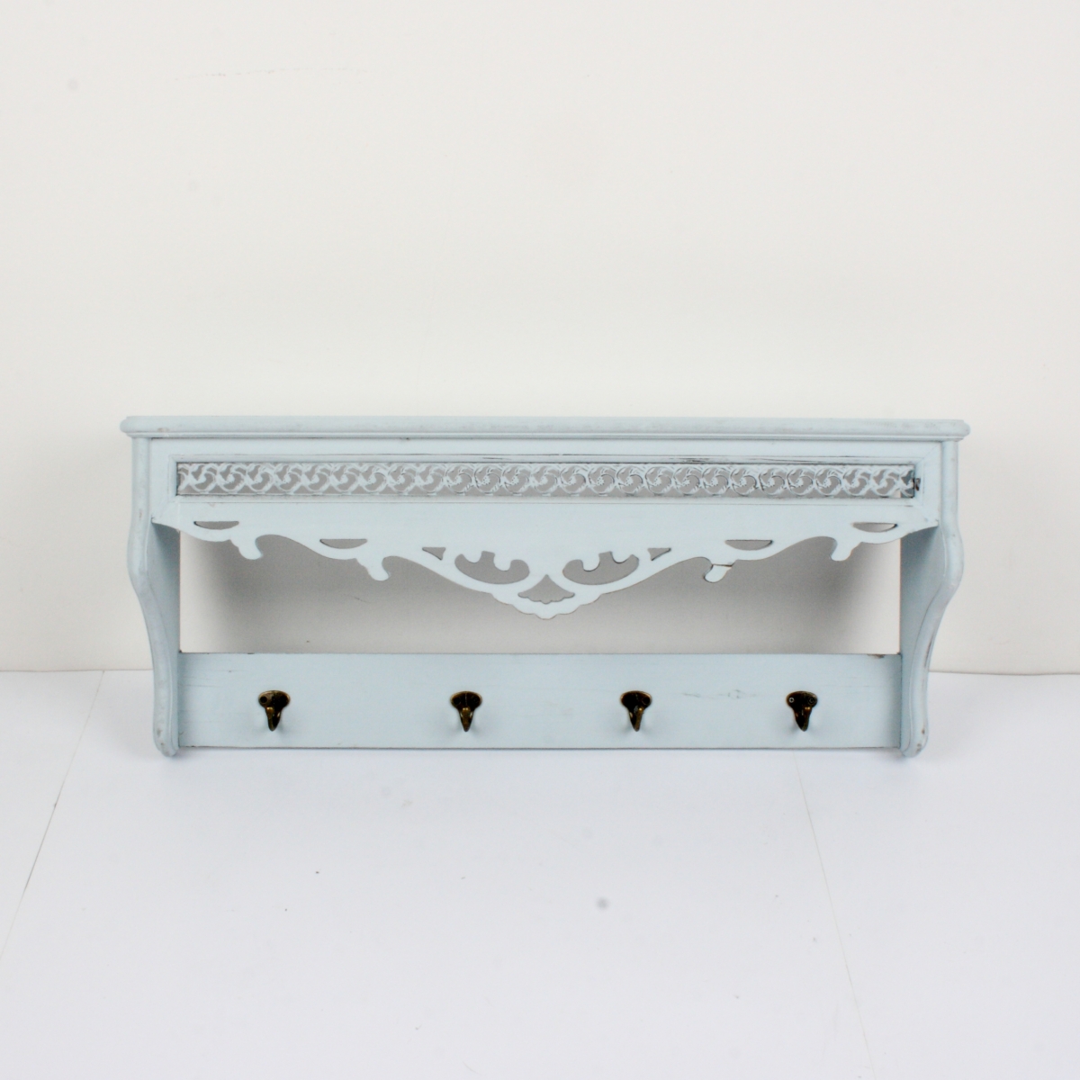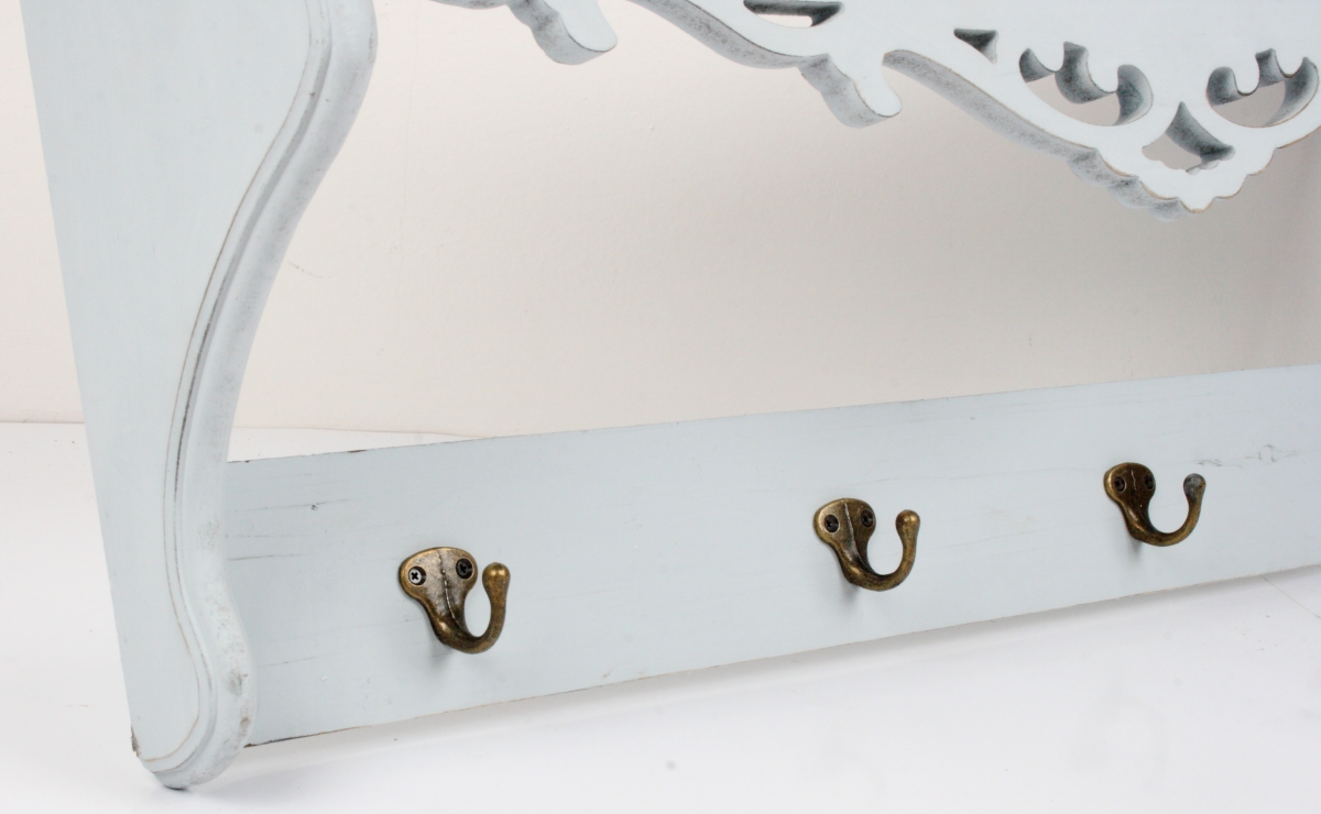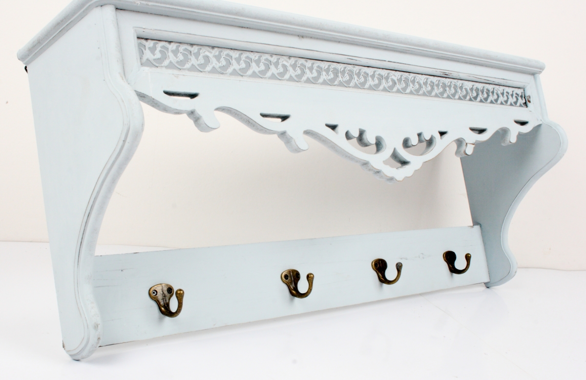 Nástenný vešiak drevený s policou a krásnou zdobenou rímsku, ktorá vo svetlo šedej farbe nádherne vynikne.