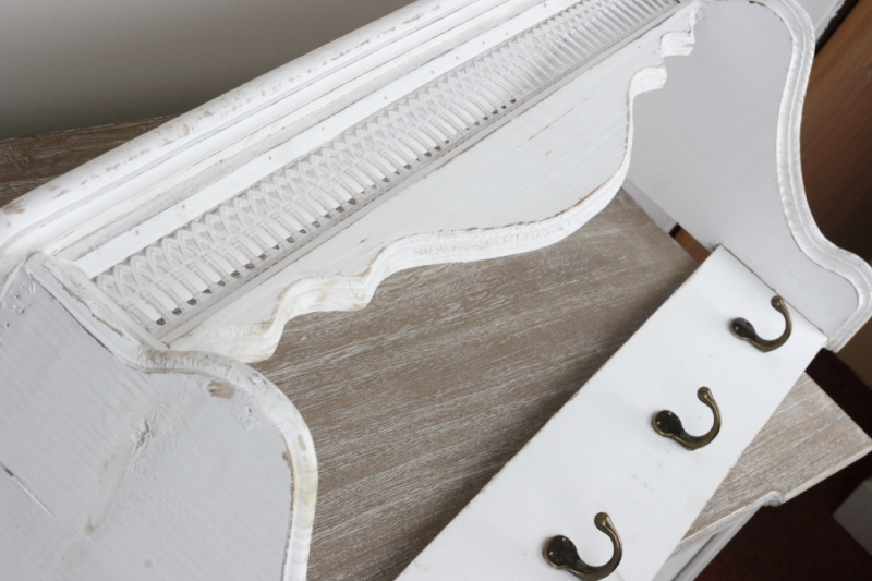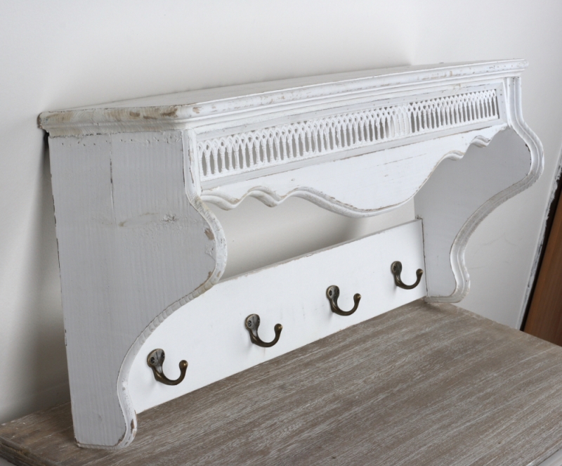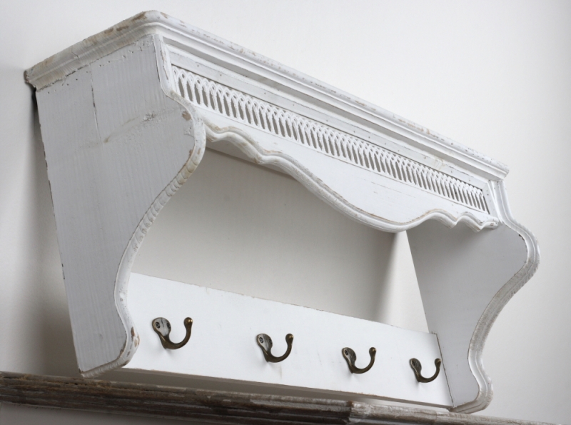 Drevený nástenný vešiak je vyrobený z mäkkého dreve a má štyri kovové Dvojháčiky. Predná strana má zdobenú rímsu a vrchnej polici môžete využiť napríklad na košíky s drobnosťami.