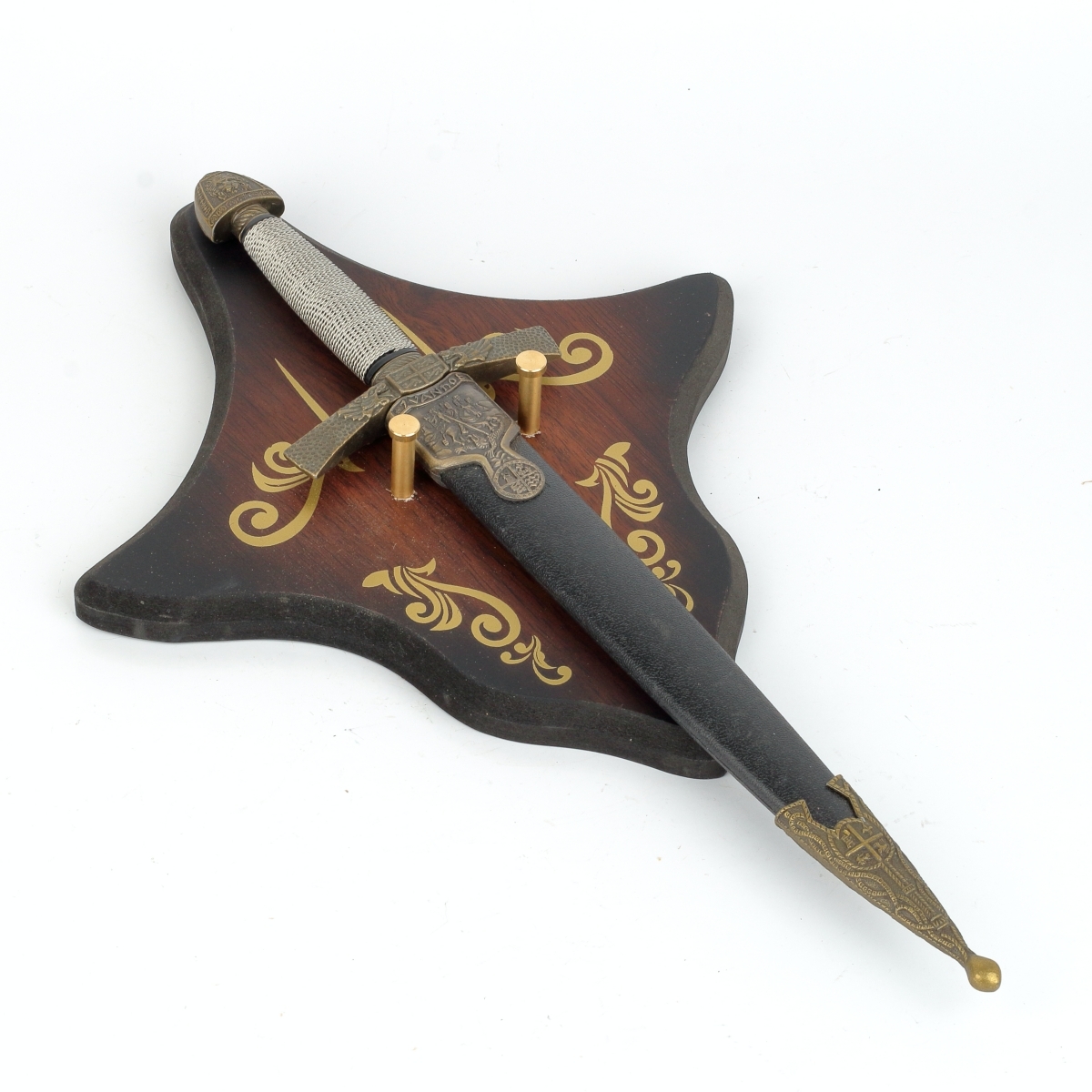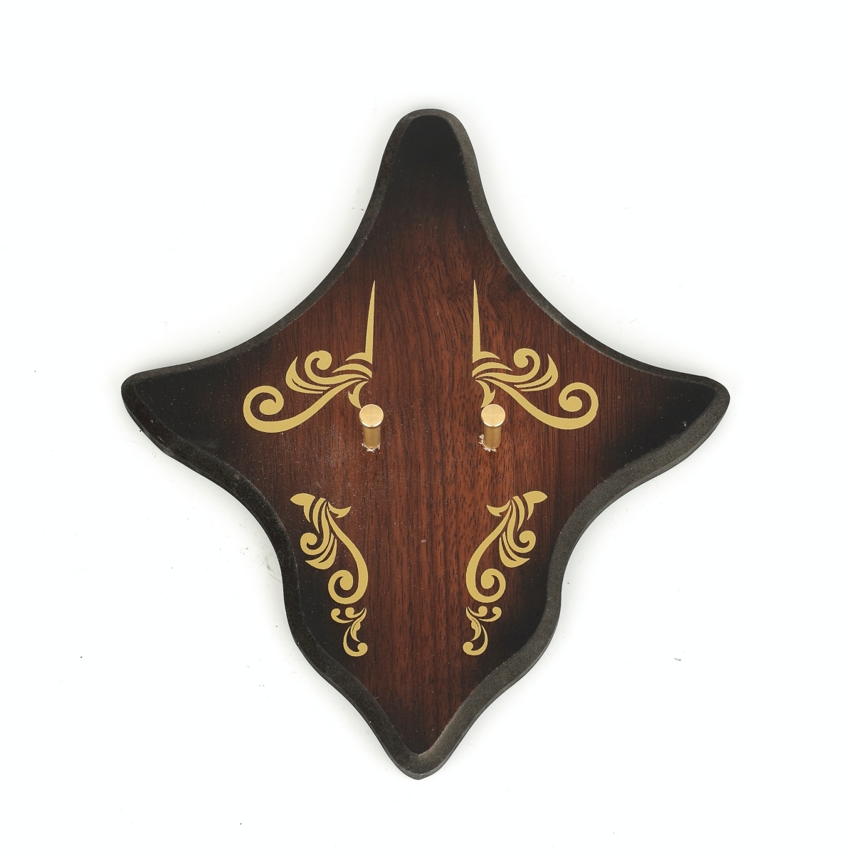 Dekoratívny drevený nástenný záves na meč sa hodí na väčšinu typov mečov, vrátane tých krátkych. Drevená doska je zaujímavo tvarovaná aj farbená, a to do odtieňov tmavo hnedej po okrajoch, až čiernej, farby. Krásne na nej vďaka tomu vyniká svetlý, ornamentálny, rastlinný dekor.