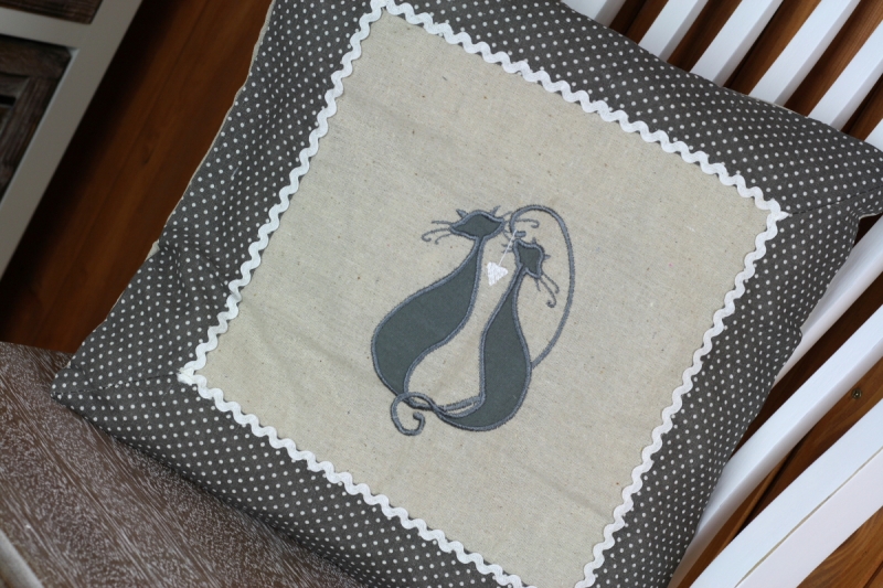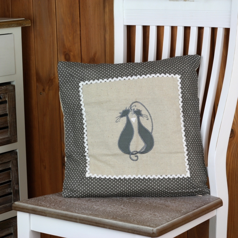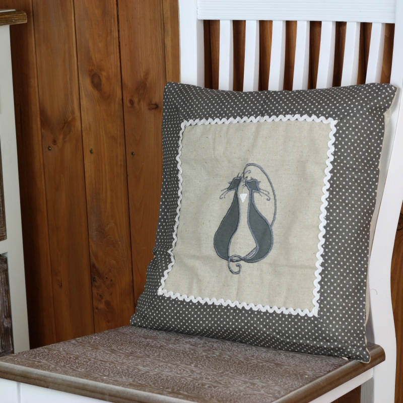 Návlek na vankúš mačka 40x40cm s motívom drobných bodiek a dvoch zamilovaných mačiek. Krajkové lemovanie vyzdvihuje romantický nádych vankúšika.