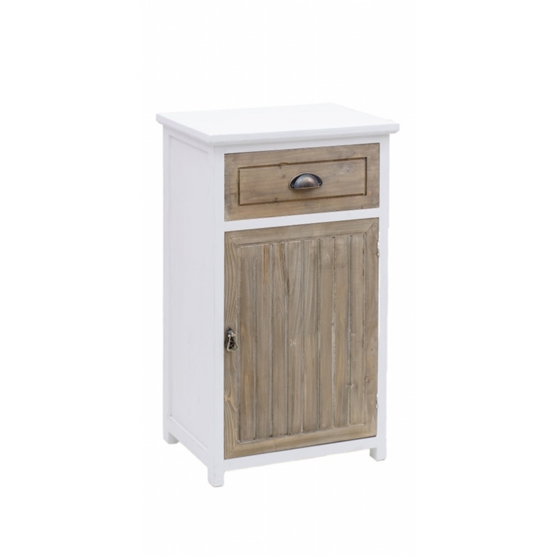 Nočný stolík má drevenú konštrukciu v bielej farbe doplnenú o dvierka a šuplík v prírodnej farbe dreva. Je ozdobený krásnymi úchytkami, ktoré celý stolík oživia.