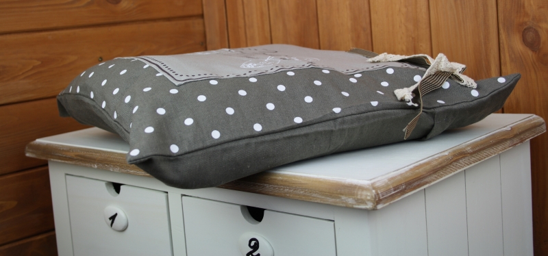 Povlak je na zips, je kombinovaný látkami v krémovej, šedej a kávovej farbe s potlačou a čipkou. Vankúš je v ponuke tiež v podobnom farebnom prevedení (dek2849).