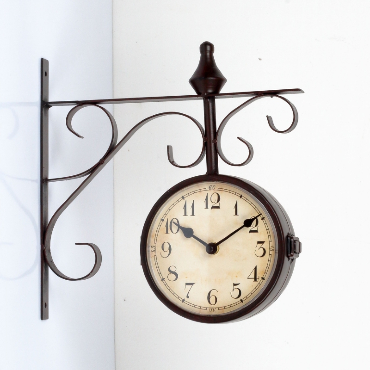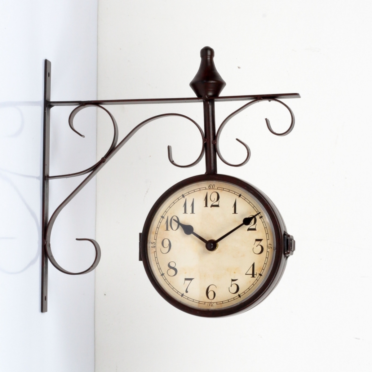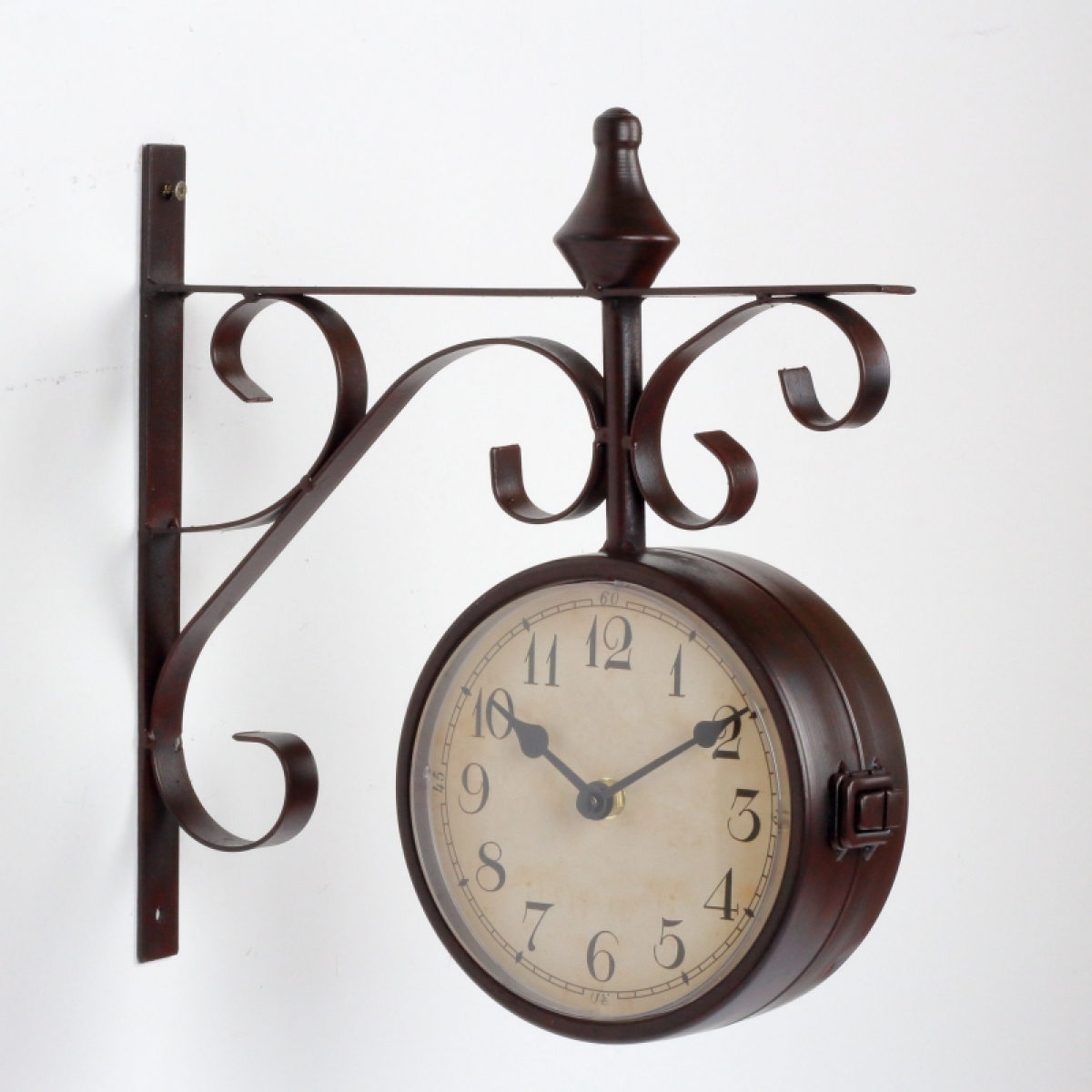 Obojstranné hodiny s arabskými číslicami 16cm sú súčasťou kovové konzoly, ktorú ľahko pripevníte na stenu interiéru i na záhrade pod pergolou.