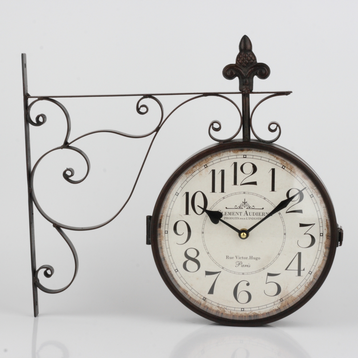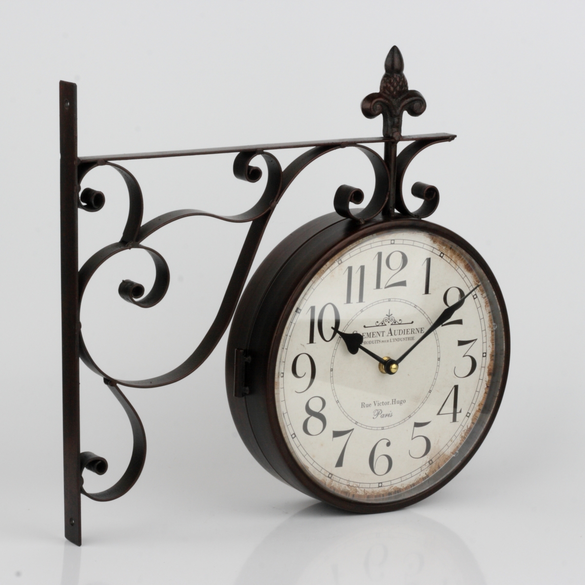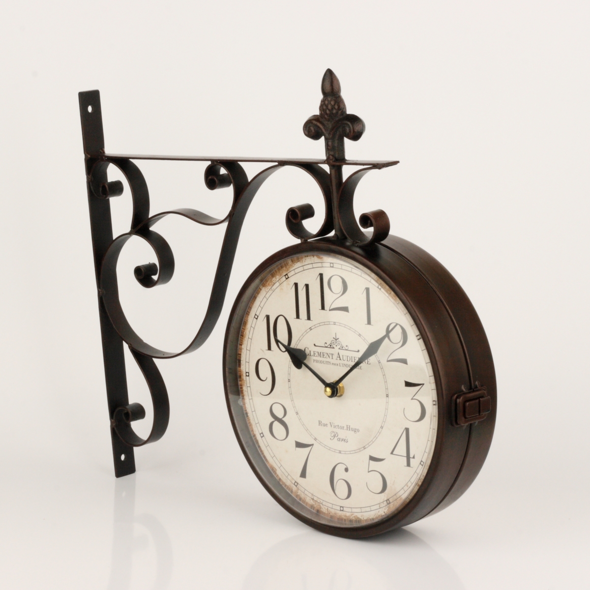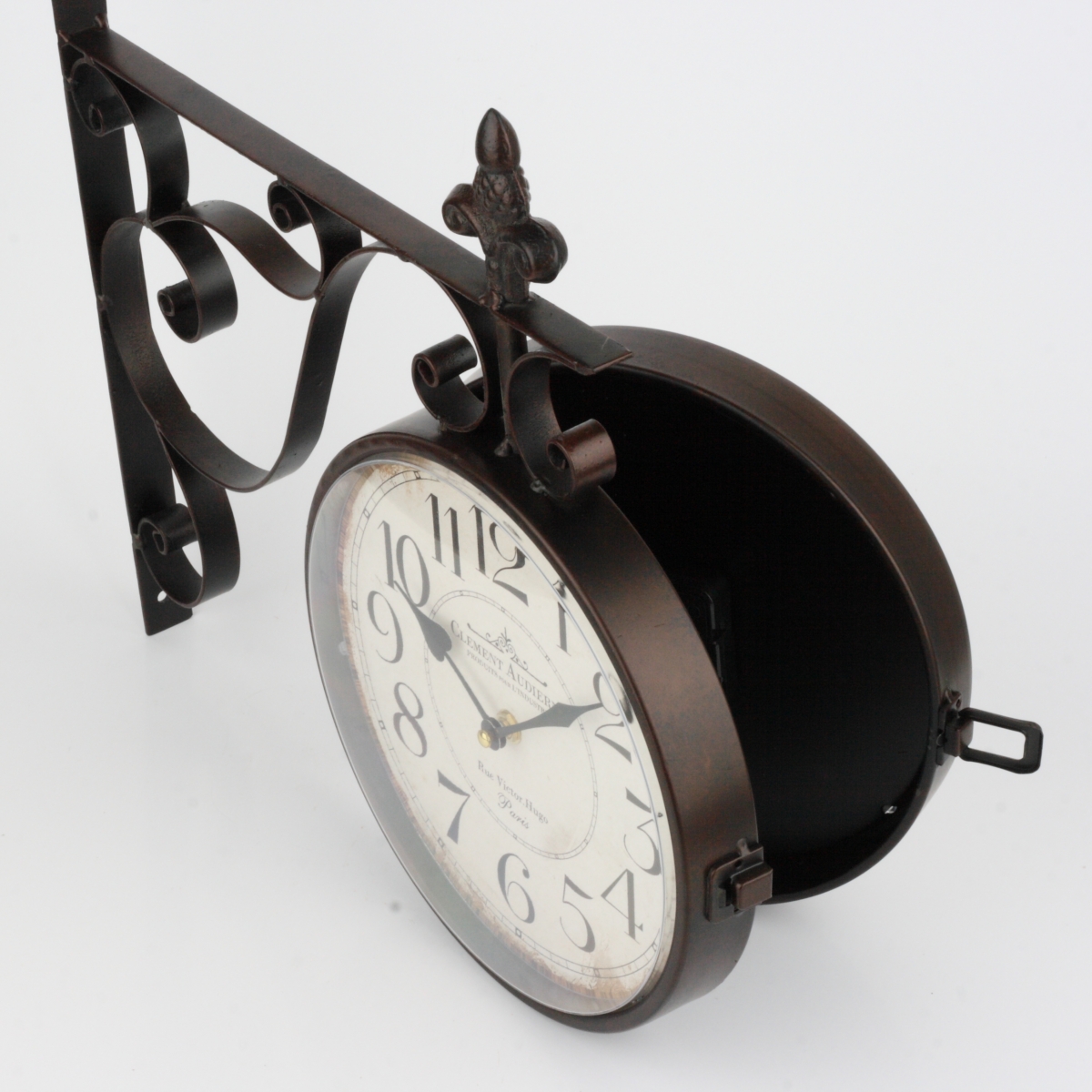 Obojstranné hodiny s arabskými číslicami Clement 40x38x7cm a tmavou konzol sa zdobeným hrotom.