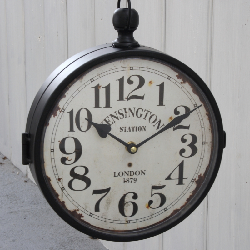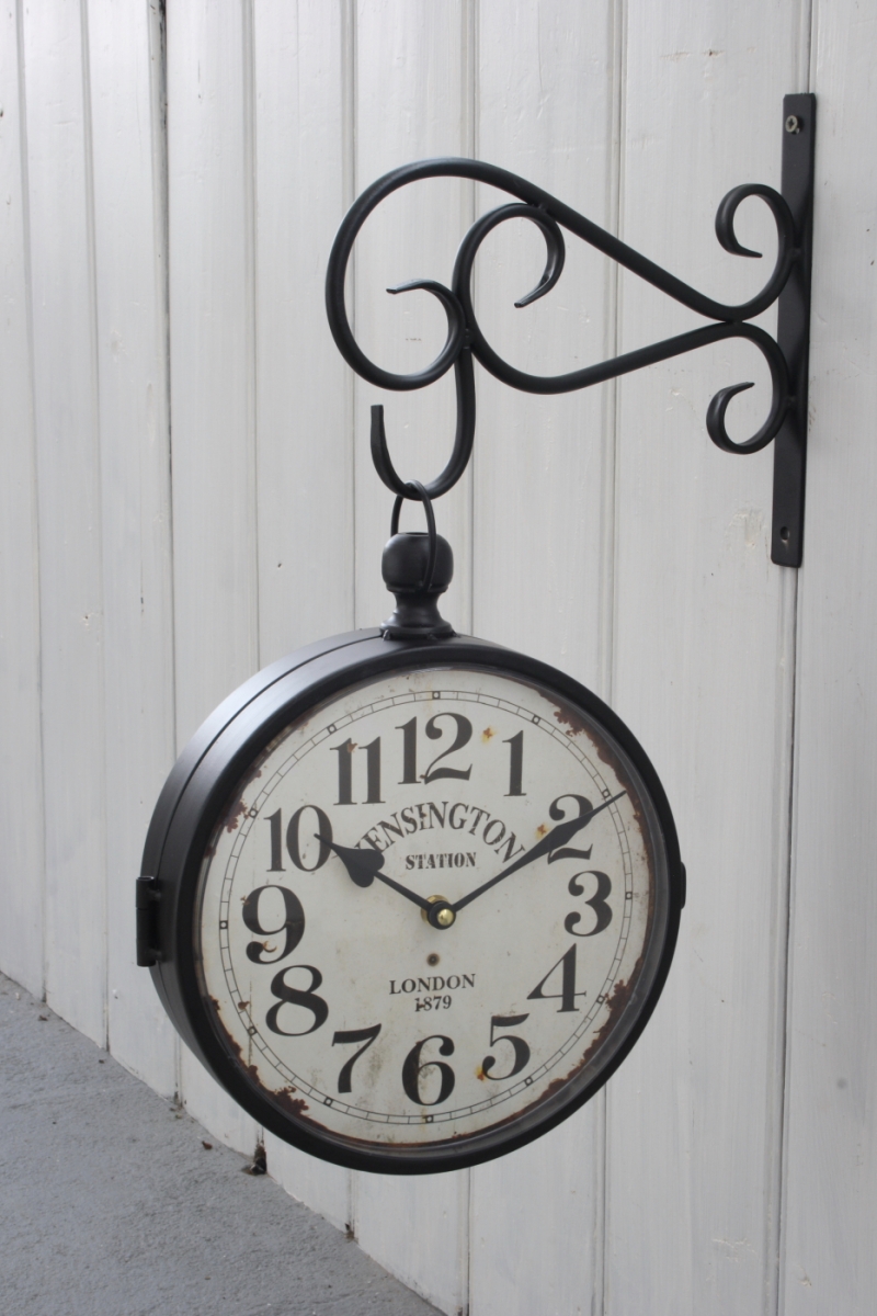 Obojstranné staničnej hodiny s veľkými číslami 24cm sú zavesené na kovovej ozdobné konzolke, ktorá sa veľmi ľahko za pomoci dvoch skrutiek pripevnia k stene. Obojstranné hodiny najlepšie vyniknú v úzkej chodbe alebo na stĺpe či trámu. Ciferník je otváracia, každá strana má vlastnú hodinový strojček Quatz na tužkové batérie AA.