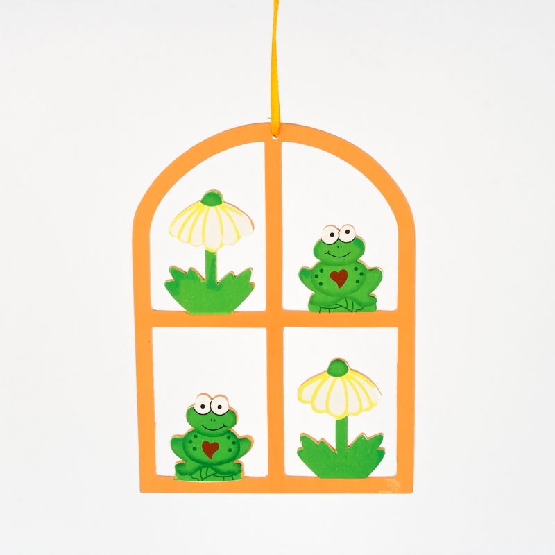 Drevený rámik okienka s ozdobami. Dekorácia je určená pre zavesenie do okna alebo na stenu.