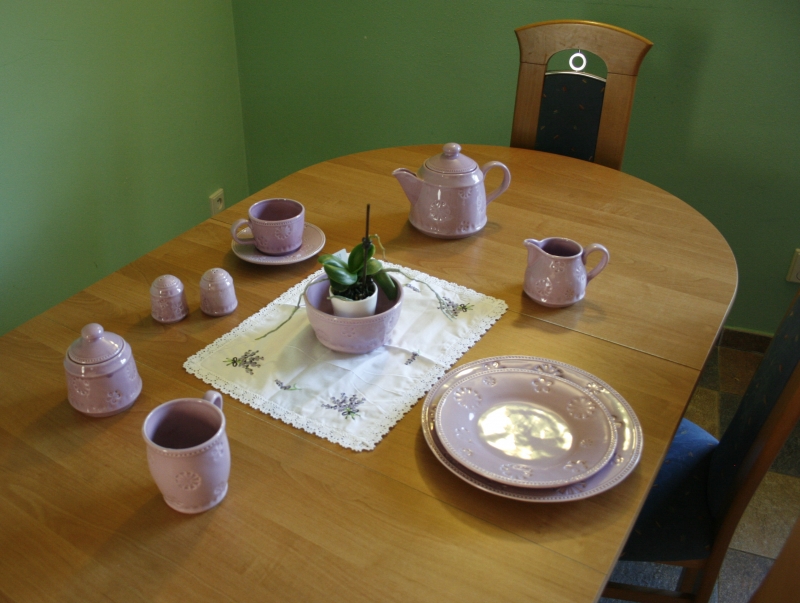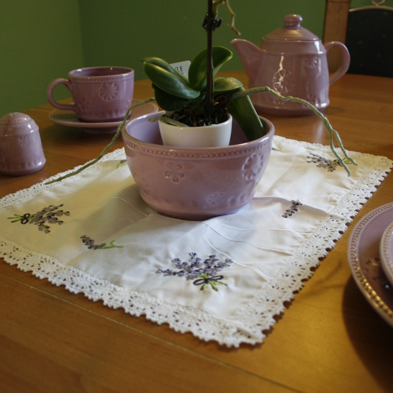 Obrus na obrázku je obdĺžnikového tvaru . Jeho rozmery sú 32 x 41 cm . Obrus je vyrobený z bavlny . Zdobí ho bavlnená čipka a nádherná levanduľová výšivka . V každom rohu obrusu je vyšitý zväzoček levanduľa, medzi nimi nájdete vyšitou levanduľovou vetvičku .