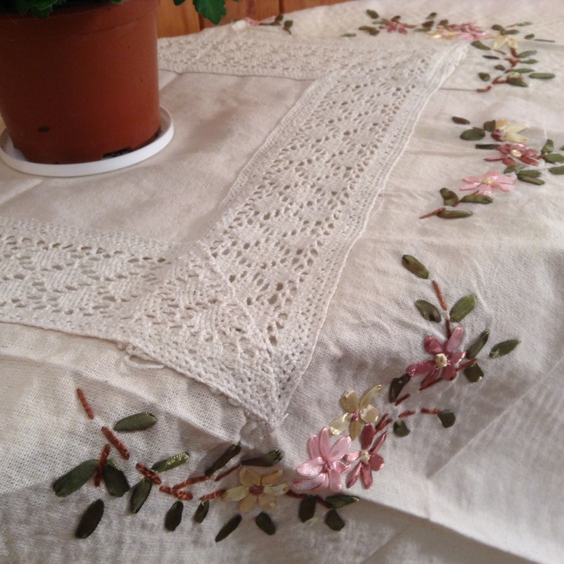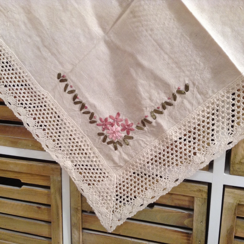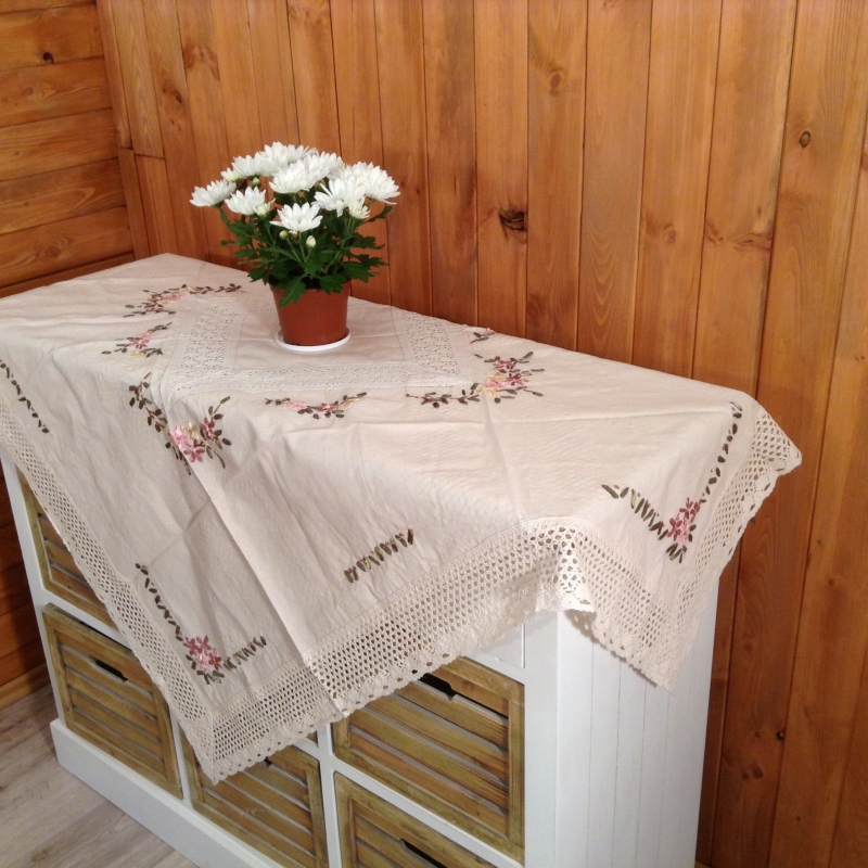 Obrus však zdobia nielen výšivky ružových kvietkov v spoločnosti zelených lístkov . Naviac je lemovaný peknou bavlnenou čipkou , ktorú nájdete aj v stredu obrusu . Hodí sa teda aj pre sviatočné príležitosti .