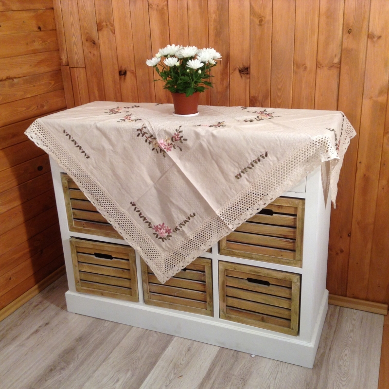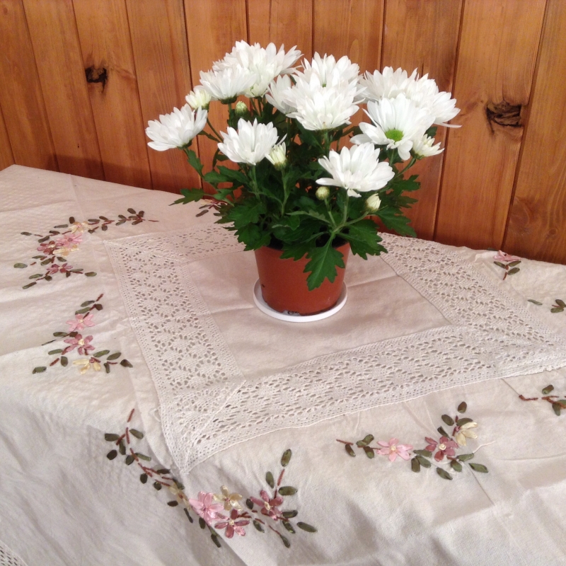 Obrus vyšívaný kvetinovým vzorom nikdy nezostarne a nezovšednie . Ten na obrázku je štvorcový a má rozmer 130 x 130 cm .