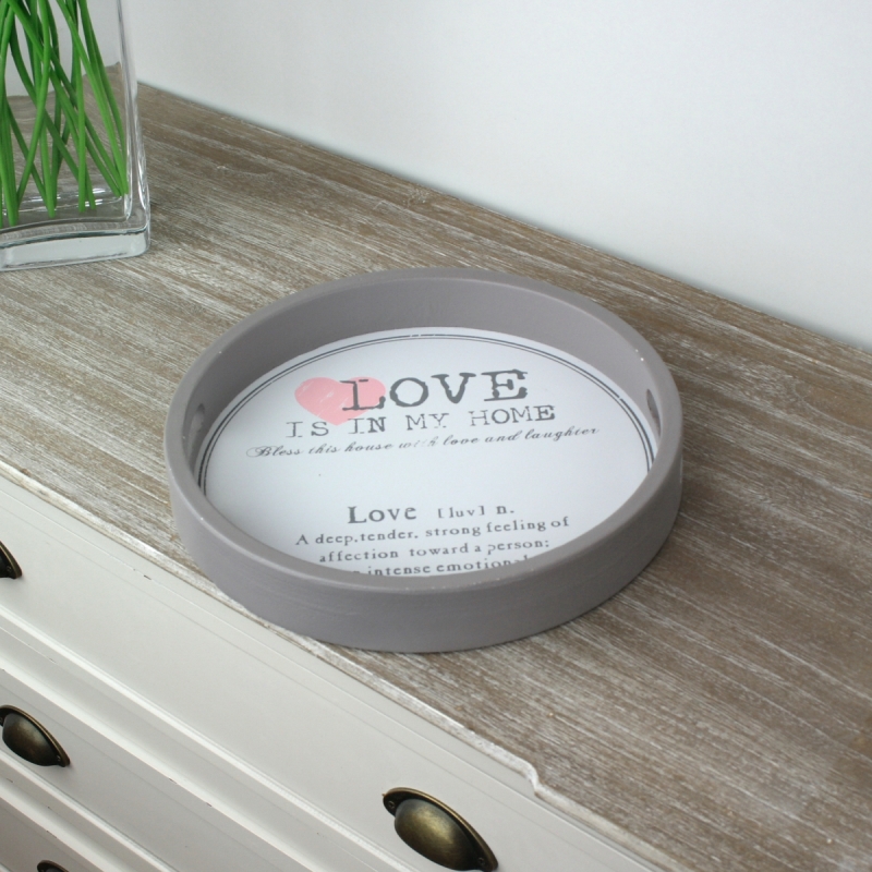 Drevený podnos v šedej farbe, dno je biele s čiernymi nápismi o domove plnom lásky.
