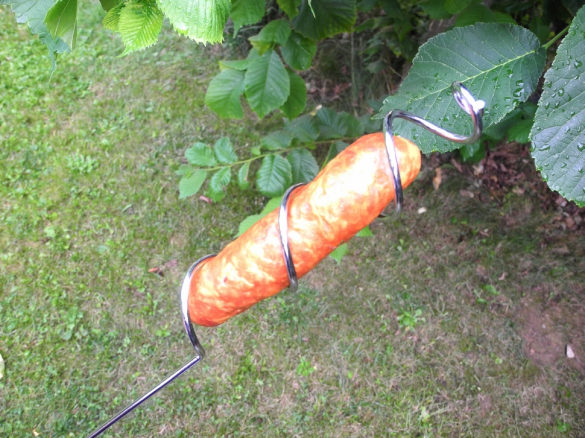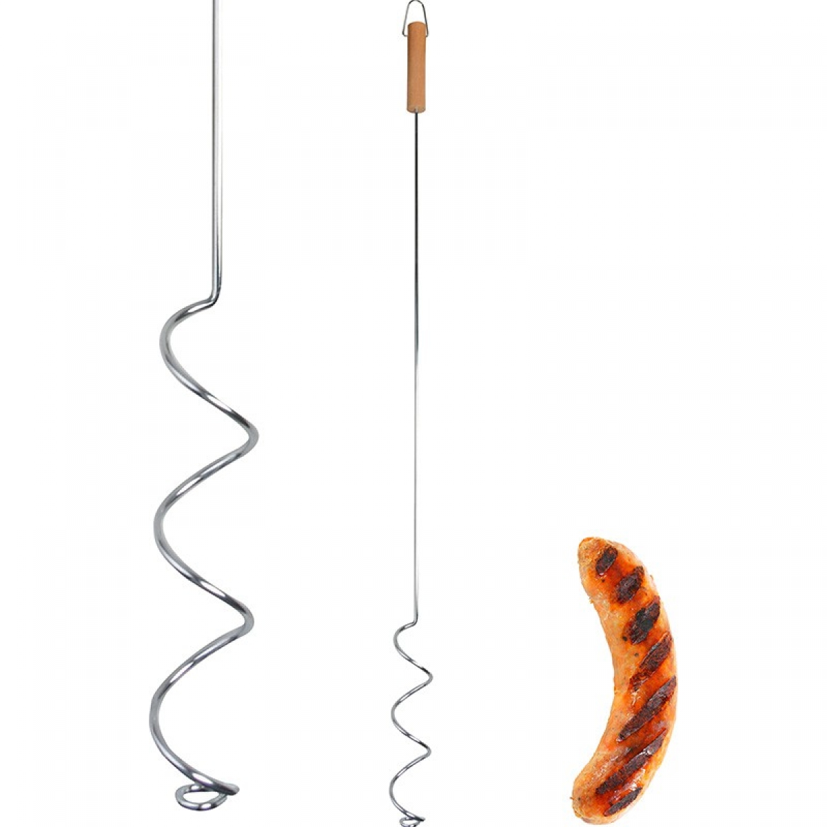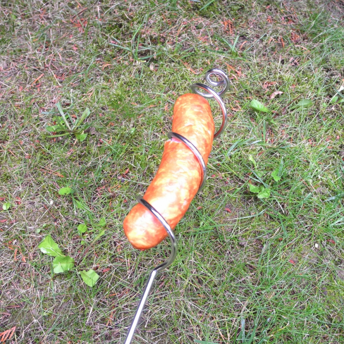 Vložte klobásu do zvlneného držiaka a držte ju v ohni pomocou čapu s drevenou rukoväťou.