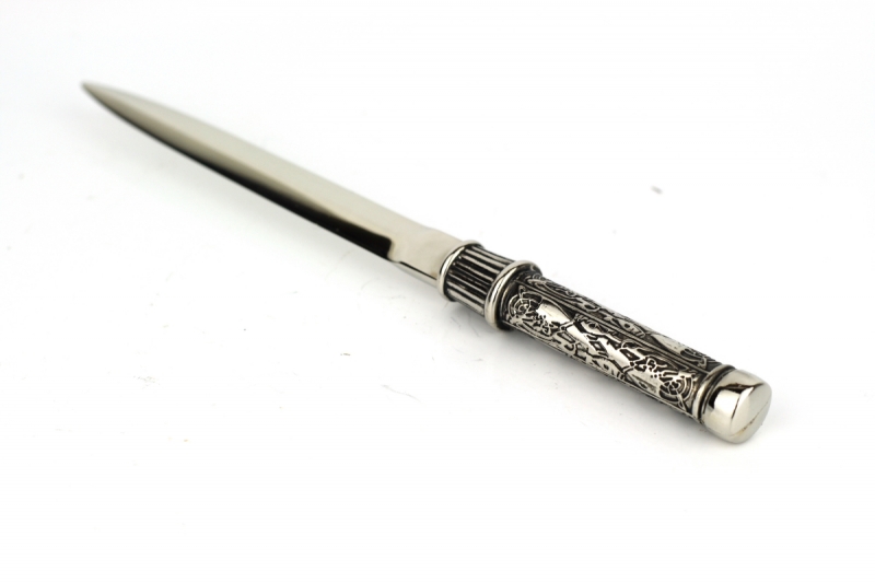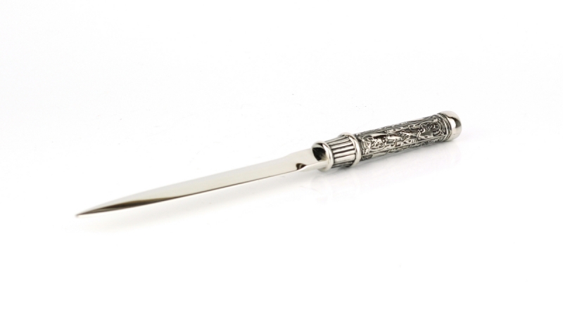 Otvárač na listy je postriebrený, má bohato zdobenú rukoväť.