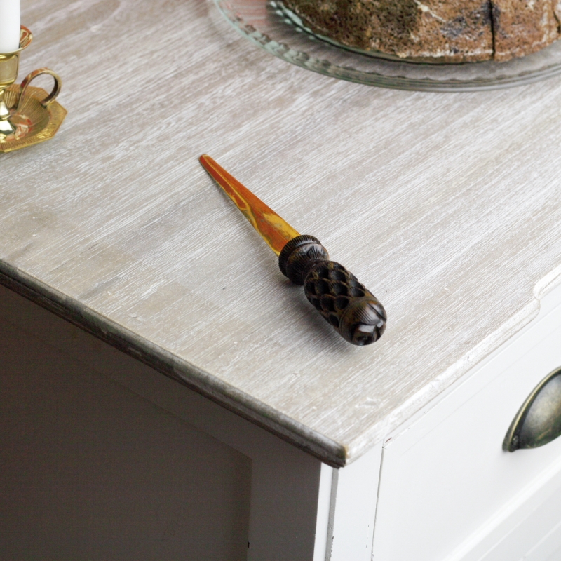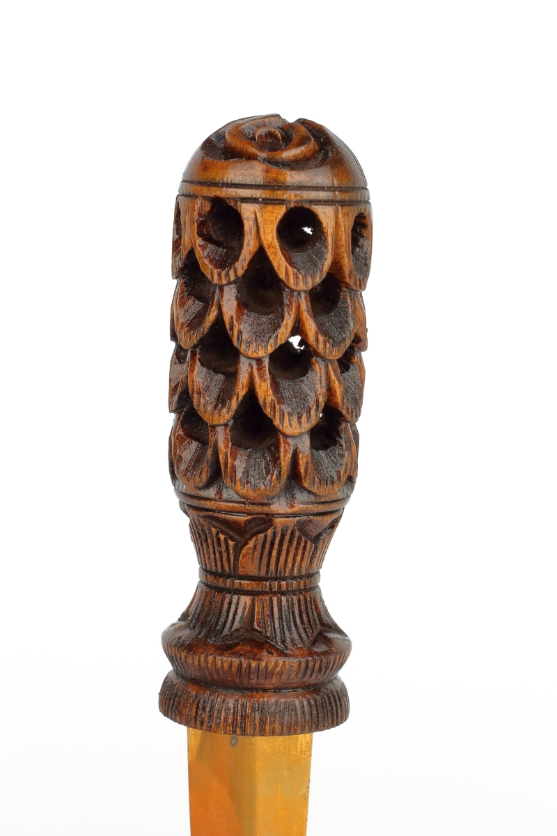 Otvárač / otvárač na listy je mosadzný s drevenou aručene vyrezávanou rukoväťou.